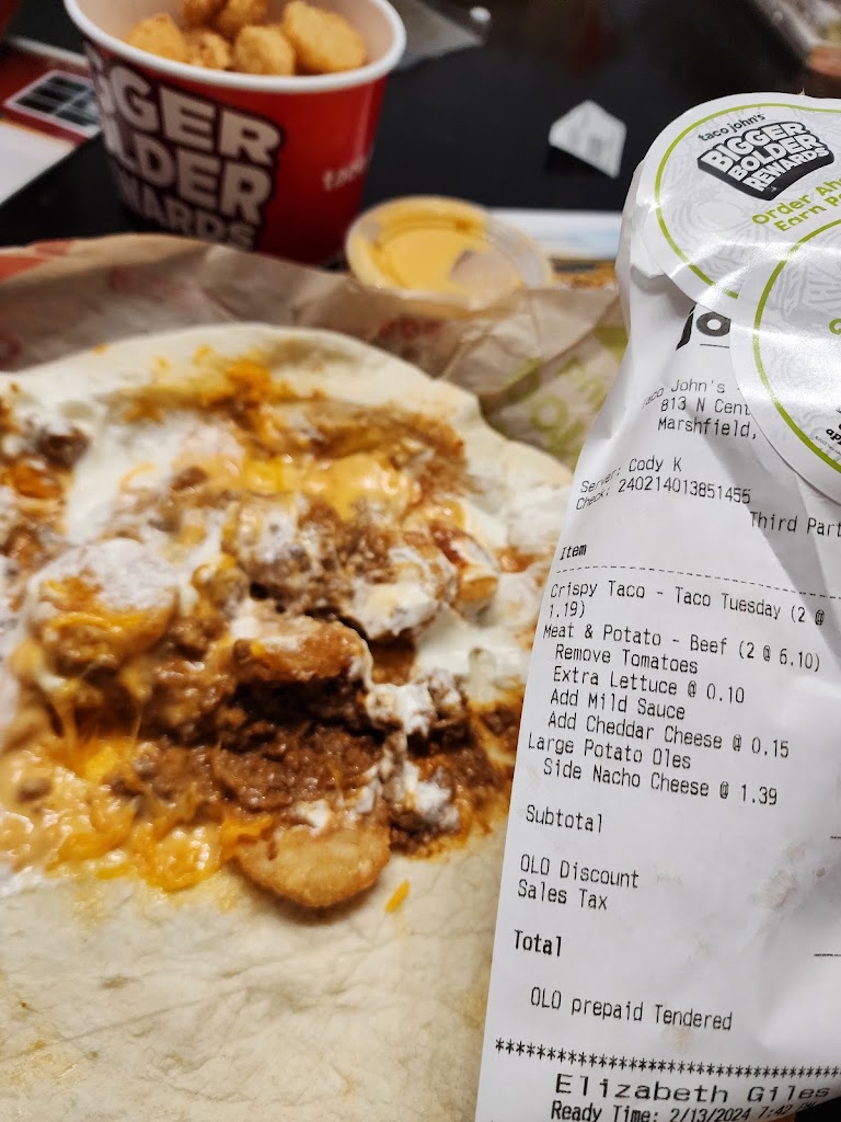 Love Taco John’s. Don’t go through DoorDash. It’s not door dashes fault when they pick up the wrong food. I called to have my order fixed, and the answer I got was “since you went through DoorDash there is nothing we can do”! Well, here’s to losing $6 and them not changing or making my order correct. If you want taco John’s go there so when they screw your order up, they will be held accountable to fix it