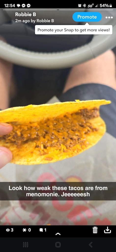 Great food had the Taco Salad and was impressed with the friendly staff including the manager. When I am back for the fall at UW-Stout, I will absolutely stop by here for Tacos.