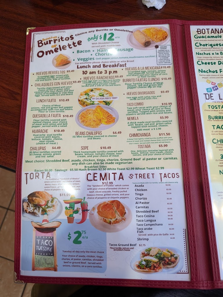 I had the carne asada, and my husband had the street tacos. It was the best Mexican I have had outside of Mexico. The refried beans were well seasoned, and the guacamole was authentic—made in-house! My husband described the tacos as “excellent.” You could give Madison’s best a run for the money if you jazzed up the interior by getting rid of the old Daisy Cafe furniture and starting from fresh.
