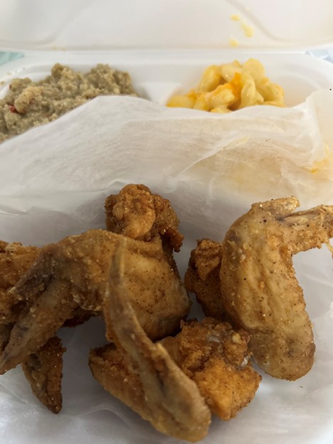 My husband got the chicken wing platter. The sides were awesome (yams, greens and Mac and cheese) but the wings themselves were a little under flavored for his liking.