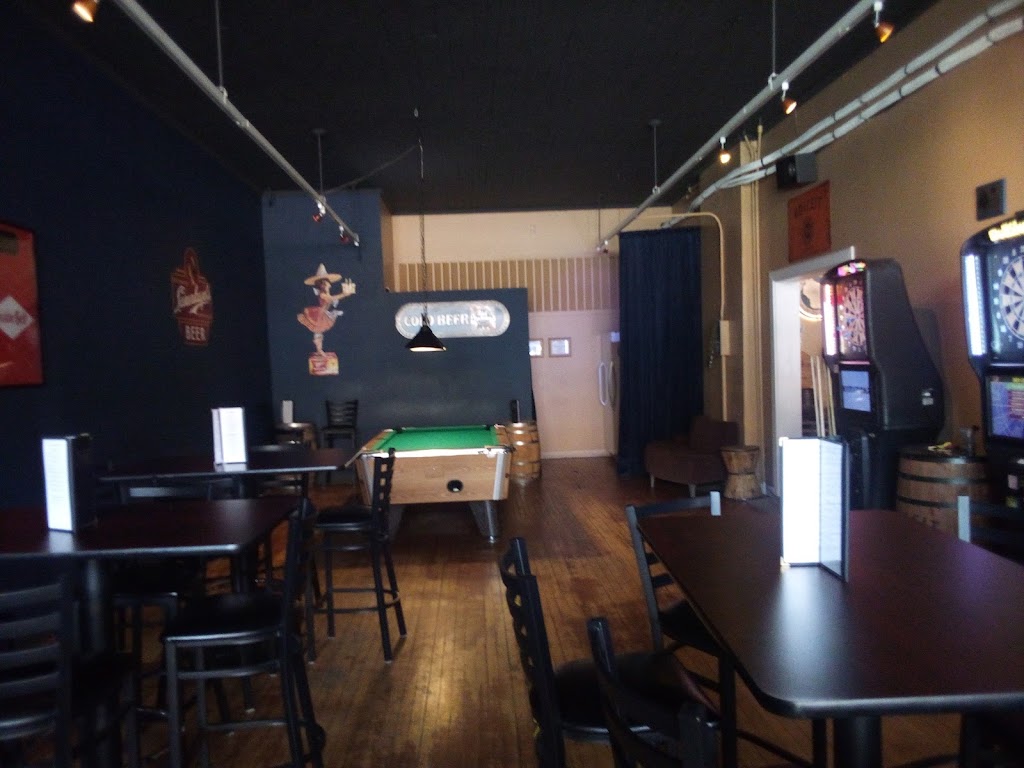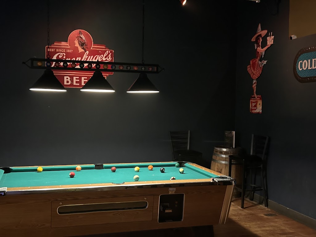 The Game Room area has a pool table, foosball table, darts, and a couple of video games, along with some couches and upholstered seating areas. There is a juke box available for tunes.