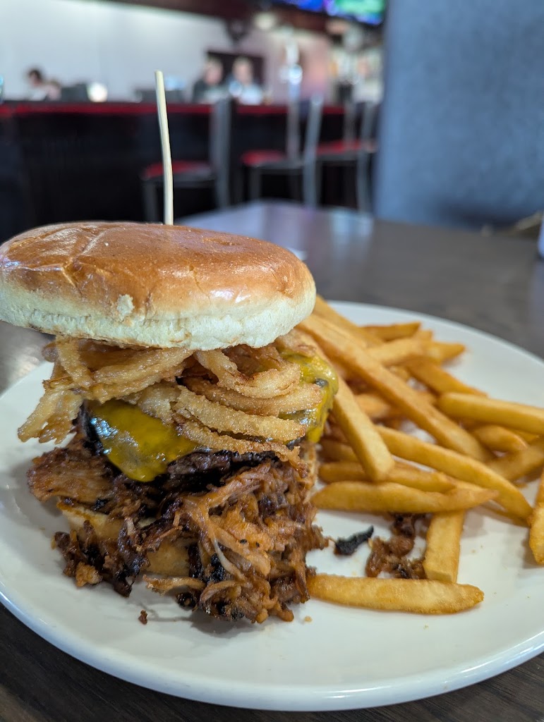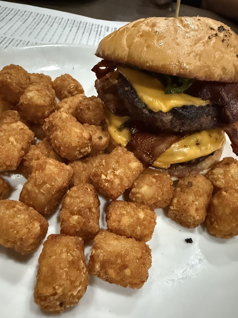 My boyfriend and I stopped for lunch on our way north. We were seated immediately. Drinks were served quickly. Didn’t order any fancy drinks, just Captain and Coke for me and a beer for him. We ordered the sampler platter appetizer, which had a lot of variety. He ordered the primetime burger and tater tots. I ordered the jalapeno popper burger and fries. Everything was served hot and tasted great. Our waitress was friendly and attentive.