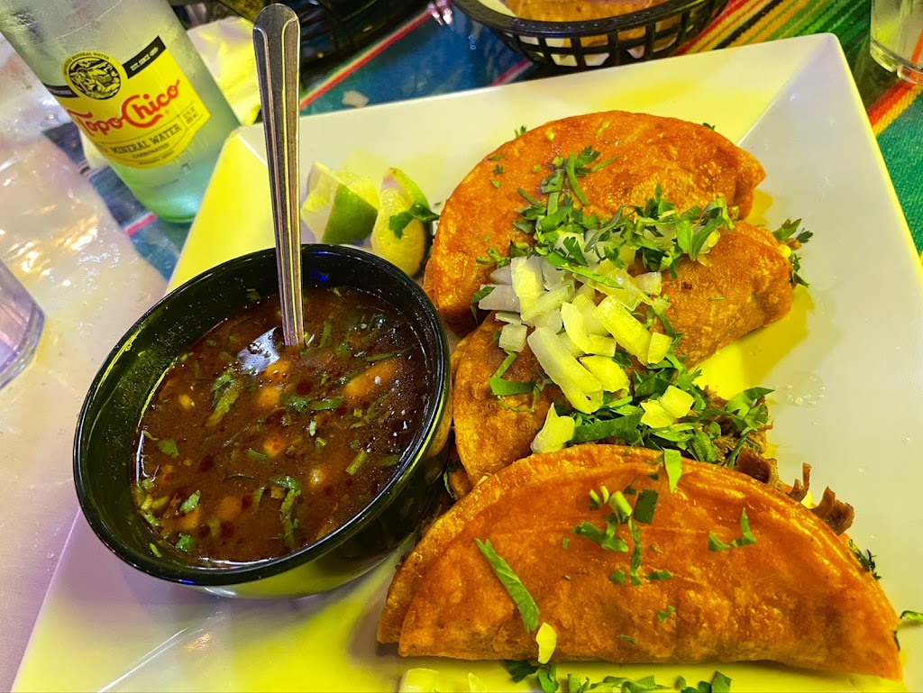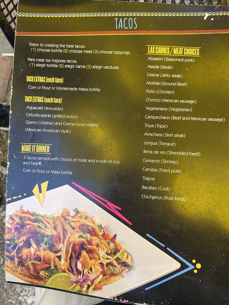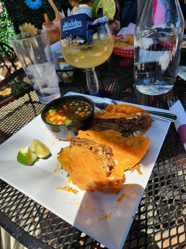 Well, the food is not good, I ordered a quesabirria and the soup was sour and I told the waitress and she exchanged them for 3 tacos de asada, the flavorless meat was all dry, they brought me the bill and they charged me for everything in full and I spoke to the manager because he was charging me for something I didn't eat and they still charged me a 20% tip, there were only two of us. The truth is that I do not recommend that you go to eat there with the menu without the price of the food.