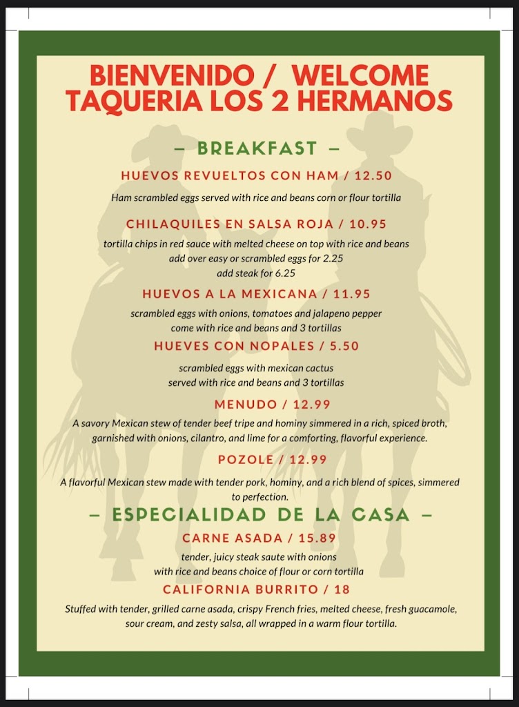 We were on our way to Menards and wanted to eat lunch. We had driven by the Taqueria Los 2 Hermanos Restaurant multiple times since it opened. We decided to give it a try. WOW⦠we are happy we did. The food was delicious! The service was fast, friendly, and informative. We loved everything that we ordered. The chips and salsa were incredible. I had the California Burrito and it was huge. My wife got the Chicken Tacos and she loved them. We also tried the ice cream bars. We will definitely be back!!!
