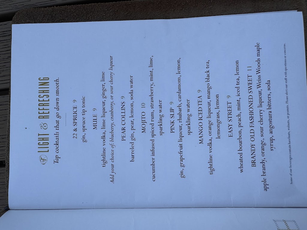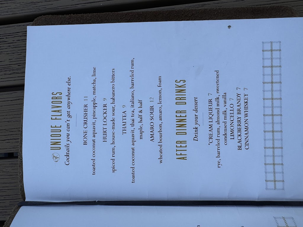 Terrific dining experience. Wonderful ambiance and of course the cocktails were fantastic. Be sure to do a distillery tour if you get a chance!