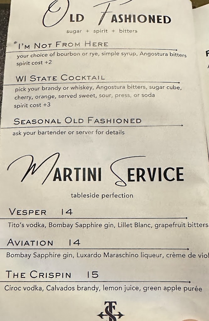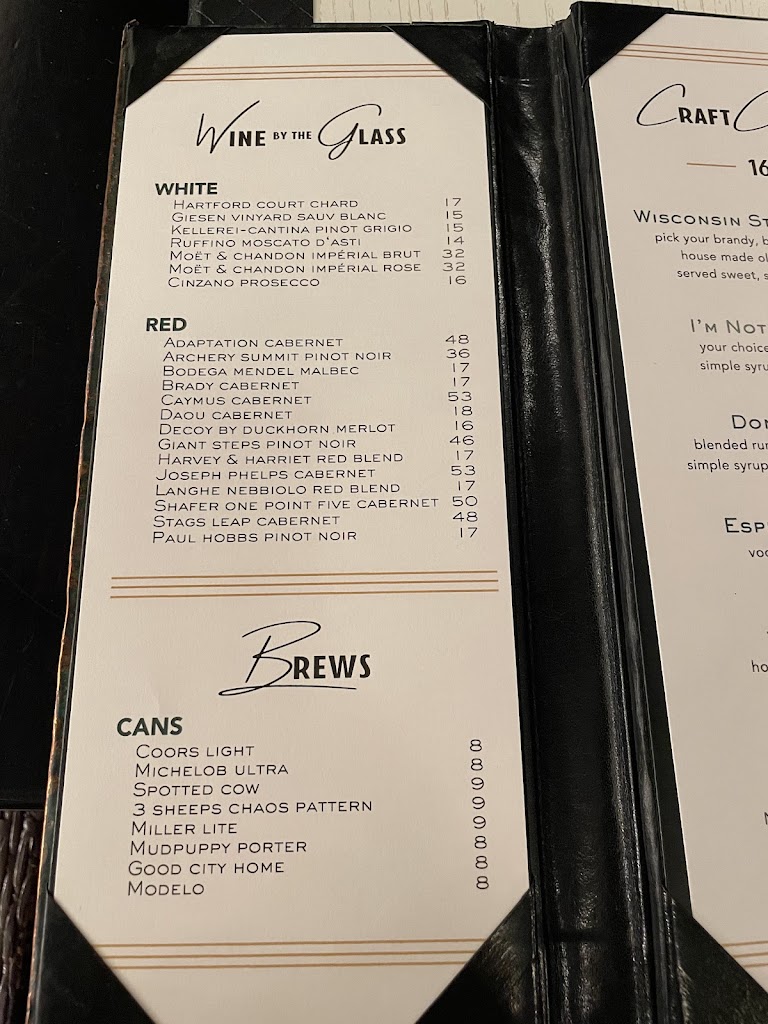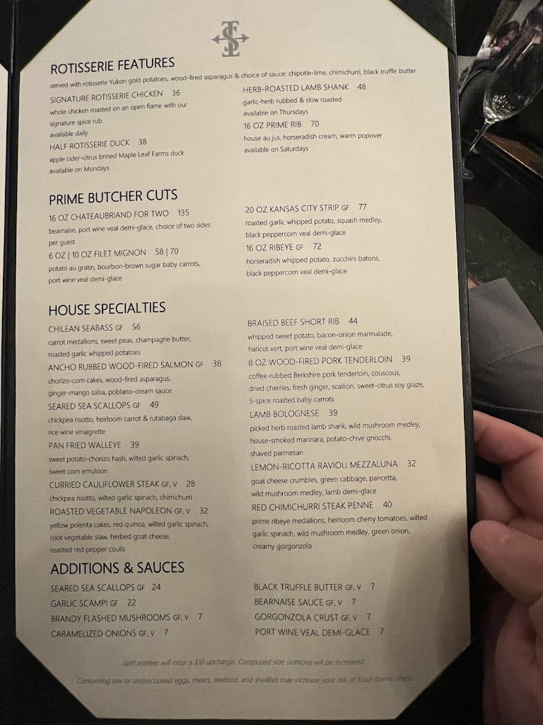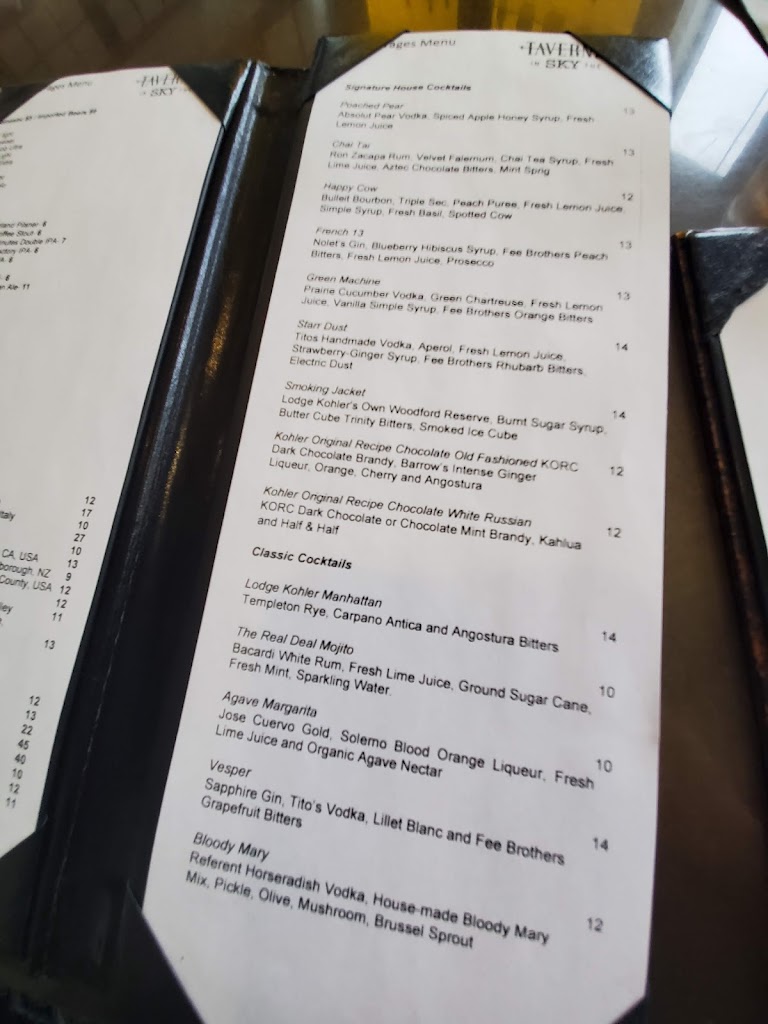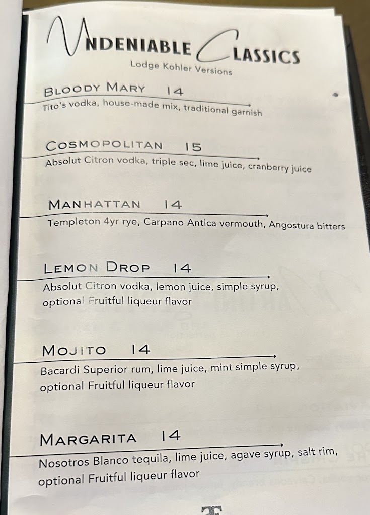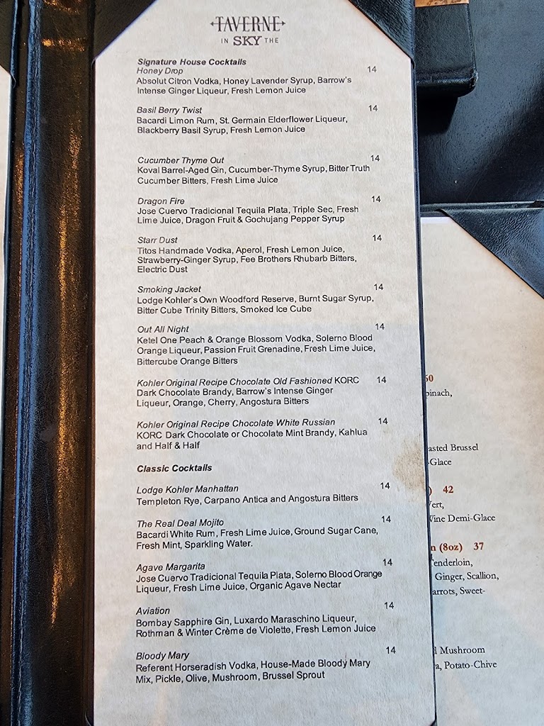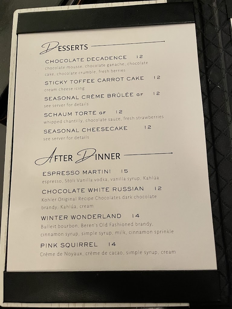 The service staff and manager asked us about our meal, the manager even asked to replace my wife’s penne when she gave him the real feedback about it, but there’s really no elegant solution for an expensive dinner that just doesn’t live up to Kohler standards. The steak was good and the sides were excellent, but for $110 we could have had an unbelievably good steak on our ceramic wood grill at home.