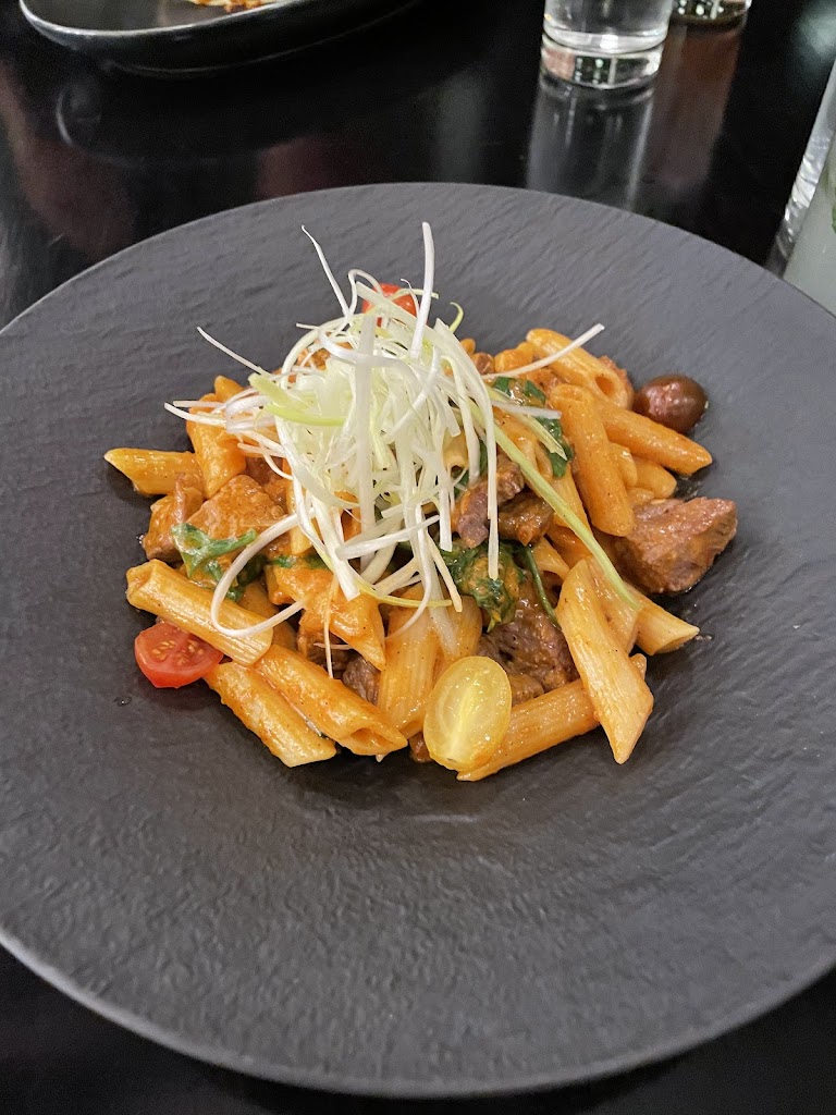 We then ordered the steak Tar Tar which was better? Bread was over cooked and a little black. I had the short rib with not so garlic mashed potatoes. It was very tender and balanced. He got the penne pasta which was flavorful but the steak was overcooked as well.