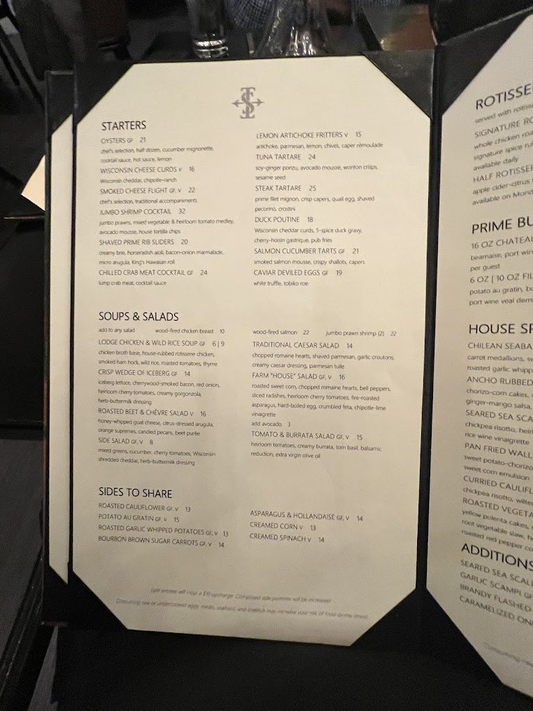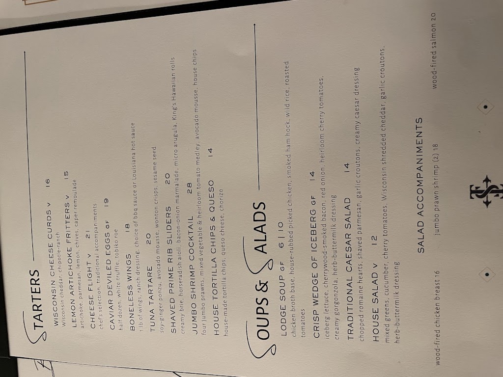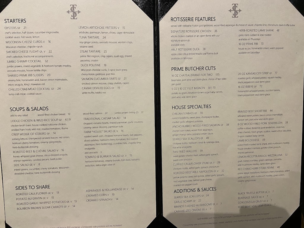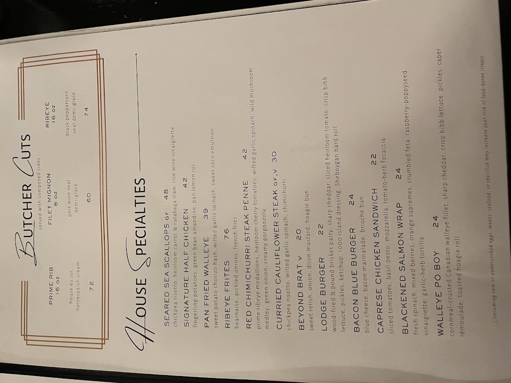 First time here and we really enjoyed it. Our server, Simeon, was helpful with suggestions, the atmosphere was quite beautiful and our food delicious. We had the smoked cheese flight, Lodge soup, ribeye steak and seared scallops. We would definitely enjoy coming back.