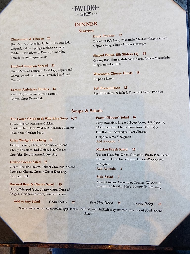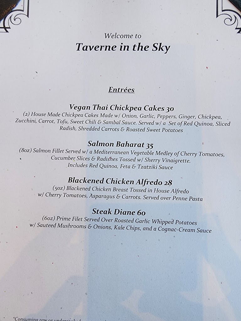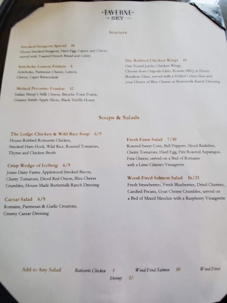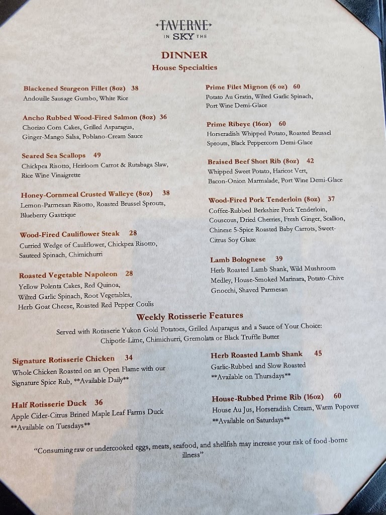 Took a party of 6 for a birthday dinner to Taverne in the Sky, which coincidentally was the Friday before a Packers Preseason game the following night. The food was tasty and high quality, albeit a bit overpriced for the area. They stated they were on a limited menu due to the Packer game, which seemed a bit odd given it wasn't terribly busy and still 24 hours away from a preseason game. The service was also slow given these factors, we found our table with empty drinks a few times. When we asked to split the check (we had 3 couples dining together) they stated they wouldn't do so for parties of 6 or more (isn't 8 usually the cut off?) AND added a 25% automatic gratuity. Overall, while the food and view were good, the price and service didn't meet the high price tag for our outing; I couldn't recommend Taverne in the Sky, especially for groups of 6.