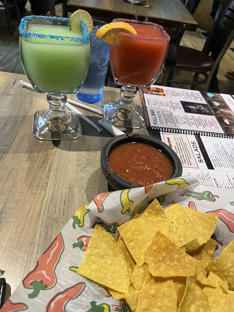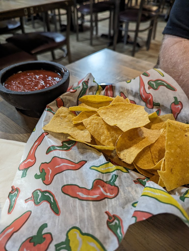 We stopped in for dinner on a Friday evening. My dish was chicken enchiladas, rice and salad. The enchiladas were excellent, meaty with savory seasoning. The house chips were thick, crunchy, and fresh - above average. The salsa was a generous serving and also above average. The margaritas were excellent, with a nice touch with the salt on the rim dyed to match the drink color. Prices were slightly below average. There is a bar in the front, with seating area in the back. Seating area has high backed booths and tables. Table service was courteous.