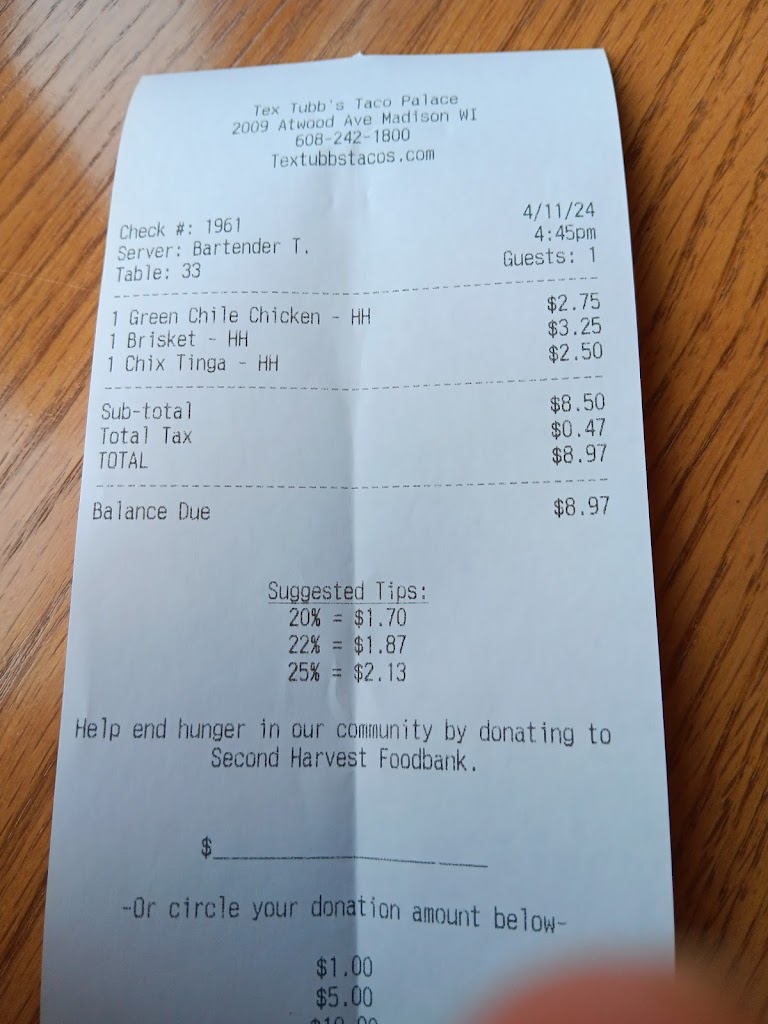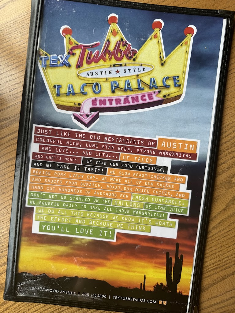 We popped in after visiting the botanical garden. The food was fantastic. If we lived in Madison, this would be our new favorite restaurant. If you get a chance to try Tex Tubb's Taco Place, you should do it. You will love it.