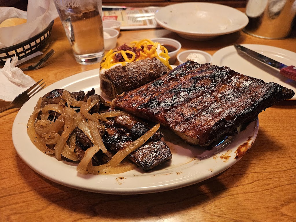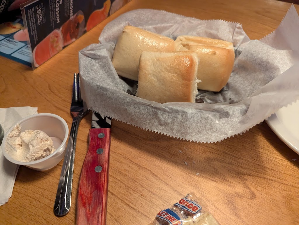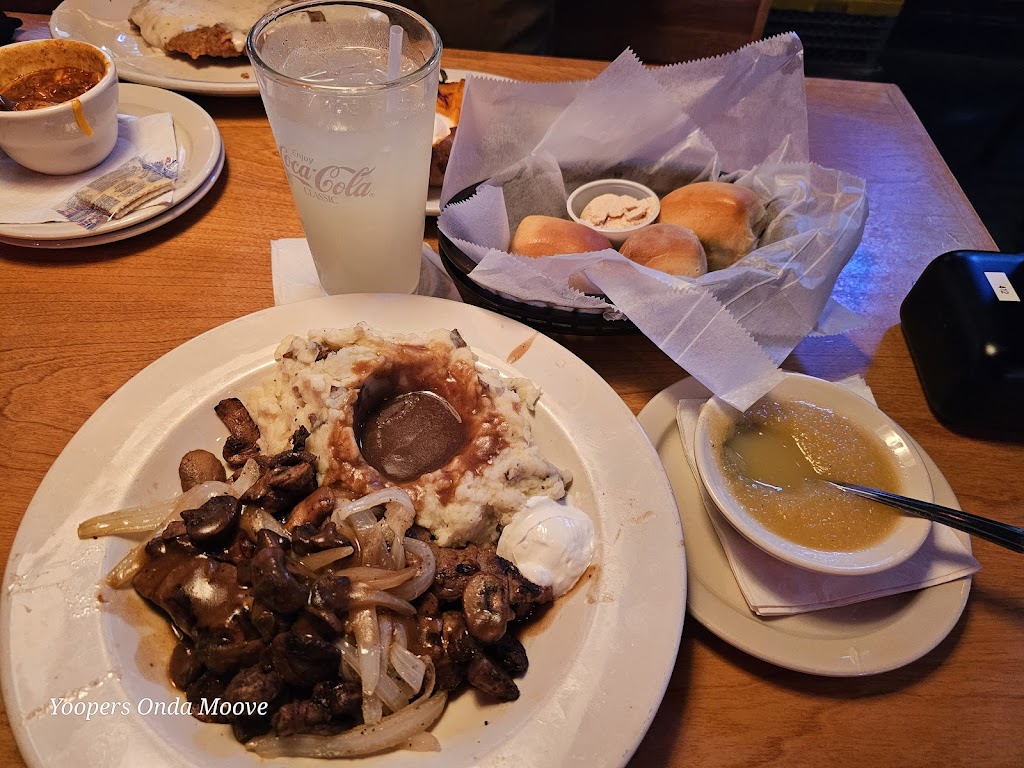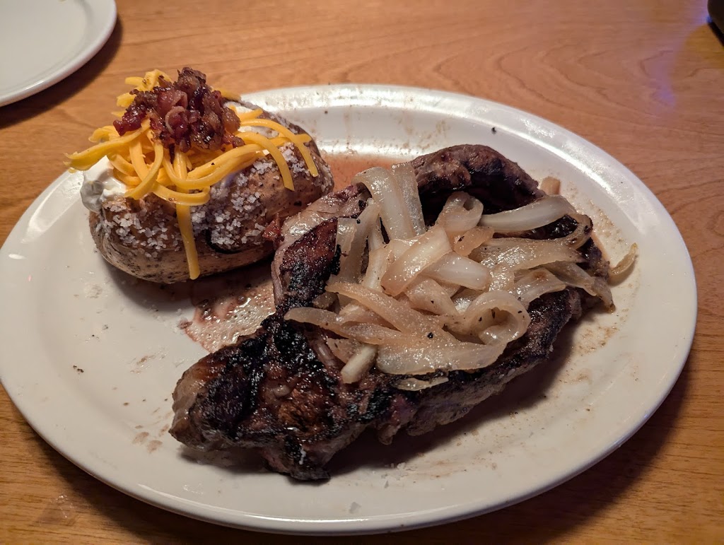 Had the double pork chops with the baked potato loaded and some green beans and three baskets of rolls with the cinnamon honey butter