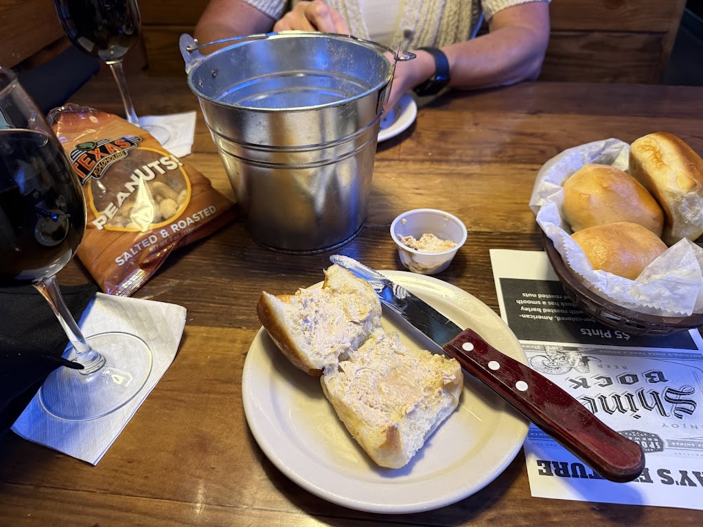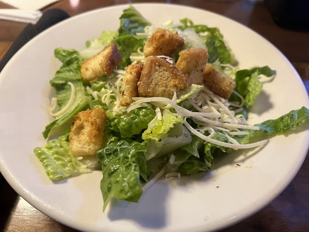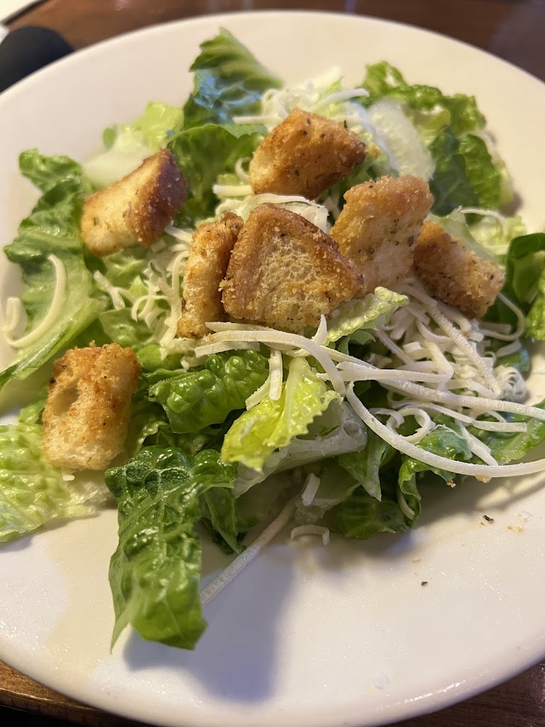 Texas Roadhouse: Texas Roadhouse was founded in 1993, with its first location in Clarksville, Indiana of all places. Although it's been around for over three decades, this was my first time visiting a location. My family and I dined at the Oak Creek location on 5/23/25 around 6:00pm. The place was packed, and I initially had a hard time finding parking. Before getting into the food, I do have to say that I'm disappointed that they do not take reservations. That's a peeve of mine when it comes to restaurants. I see no reason not to do it, especially if the restaurant does a non-refundable deposit that goes towards the bill as long as you show up. Anyway, the interior was tastefully decorated, and both the restaurant and bathroom were clean. It did get a little loud making it difficult to converse, but that's expected for this type of joint. Our server Ethan did an excellent job of keeping everyone's order straight and was polite and attentive. Each table comes with a bag of peanuts and bucket to deposit the shells in. I thought that was a nice touch. First up was my Caesar side salad. The lettuce was crisp and fresh. Each salad also comes with a plentiful amount of cheese and crunchy croutons.