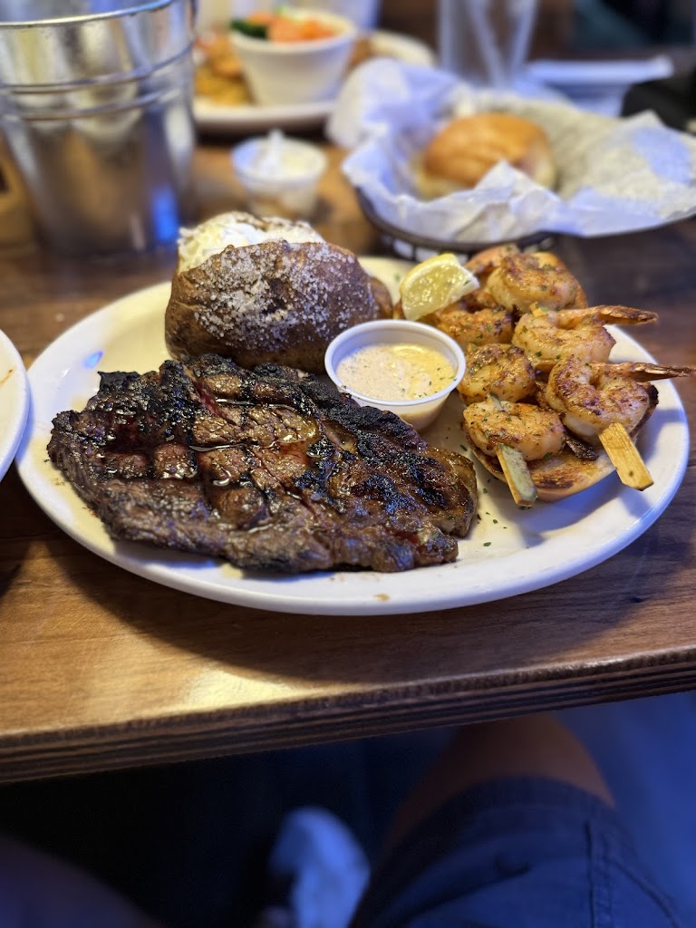 We had a great dinner, a ribeye and shrimp combo with a glass of wine. Food came as ordered, was served hot and plated well. It was excellent but the melted garlic butter for the shrimp was very salty! The bake potato was also hot and throughly cooked. The house salad was fresh and crispy. Aisha, our waitress was exceptional! She always had a smile and checked back several times during our meal. The atmosphere can be very busy and get load at times. The peanuts and fresh warm buns with the cinnamon butter are also always a plus!
