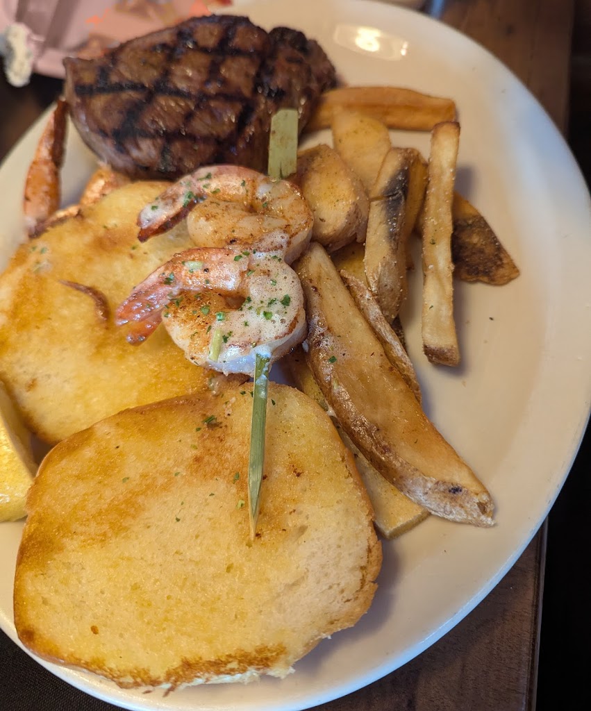 The surf and turf were great. The complementary bread was delicious, the Cesar salad was only lettuce and dressing, food came out really fast, and for a steakhouse, we found it not expensive. Blooming onion was good aswell.
