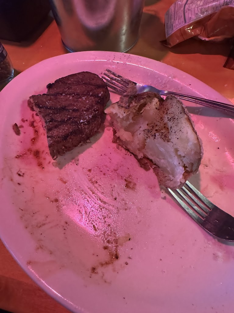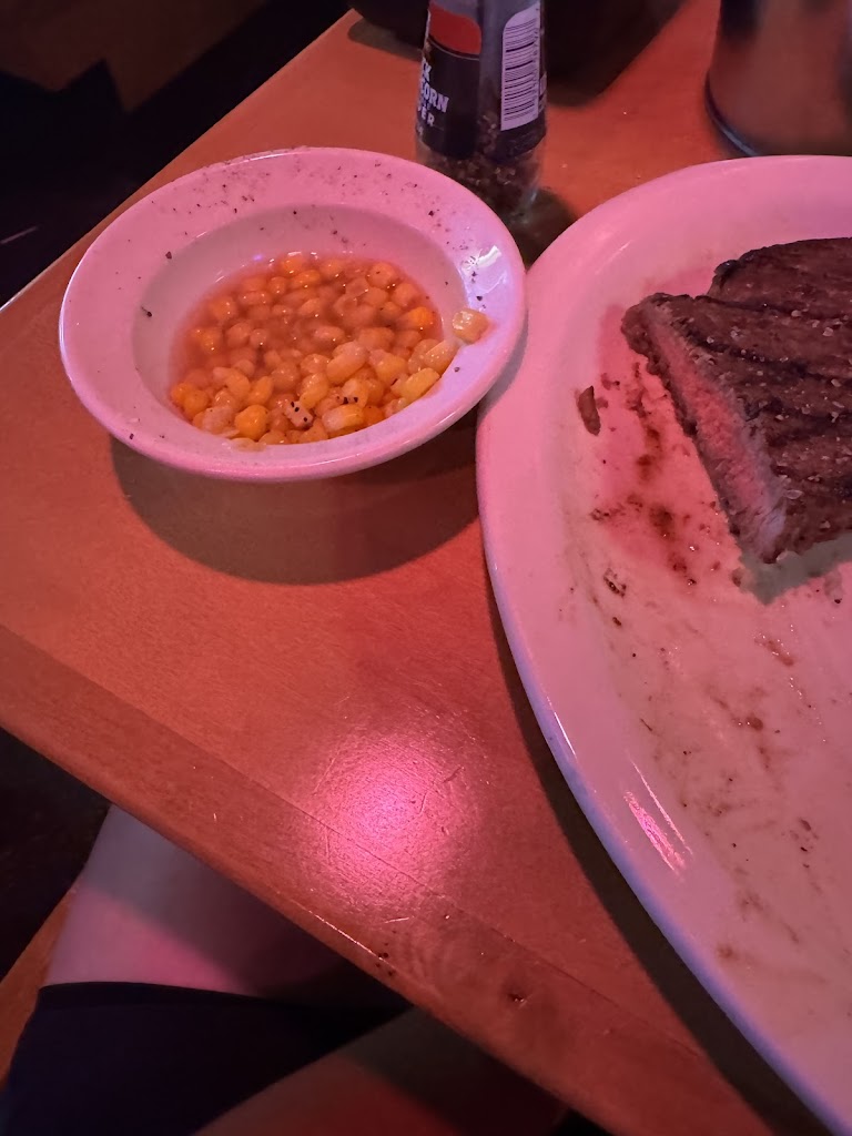 Over-fed, over-served(not alcohol)under-charged,and over-satisfied! Typically a ribeye fan, but didn’t want as rich a steak and heavy fat meal that night, so I ordered small early evening sirloin, medium rare with onions, mushrooms. Actually the sirloin, which I’ve ordered before, was plentiful, extremely tender, juicy and very flavorful. I know I enjoyed it more than a ribeye that night, and at a great price. The lowly, inexpensive sirloins actually are the showstopper for the menu, looking at price/value. Management is by walking around and you are checked constantly for ways to make your dinner better or more pleasant. During this beef pricing disaster, it was a wonderful surprise.