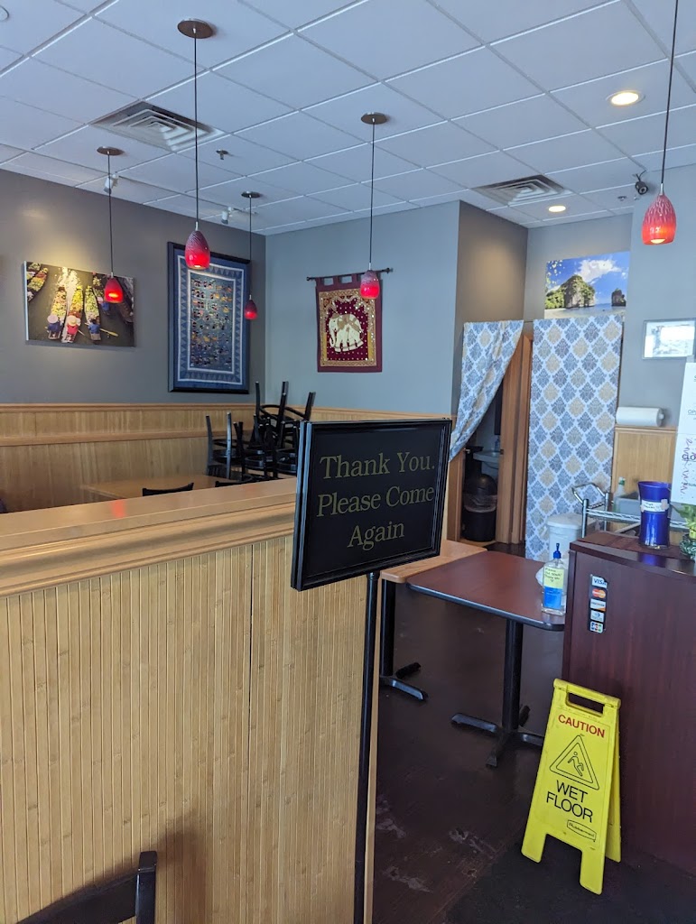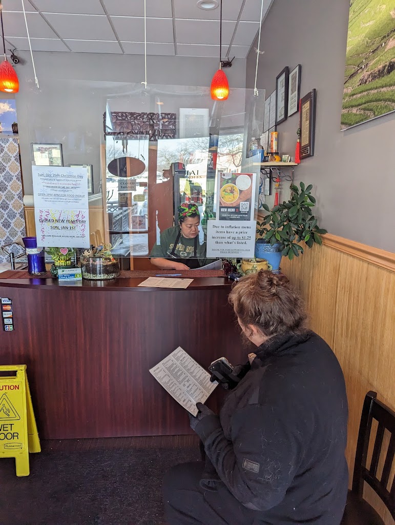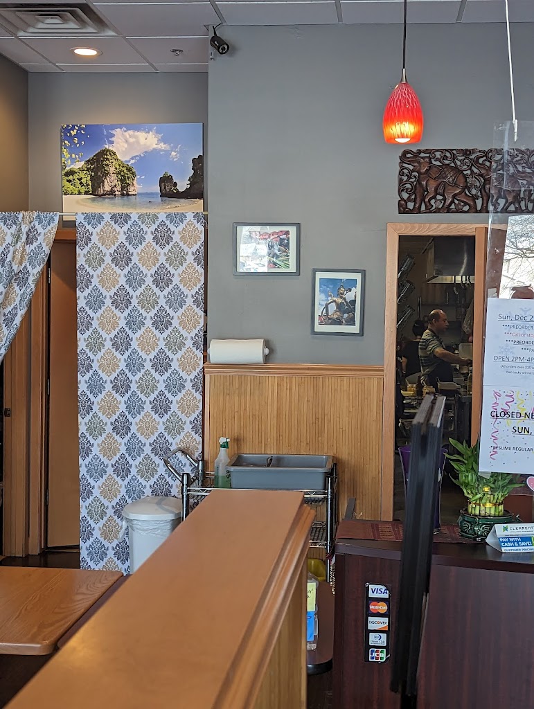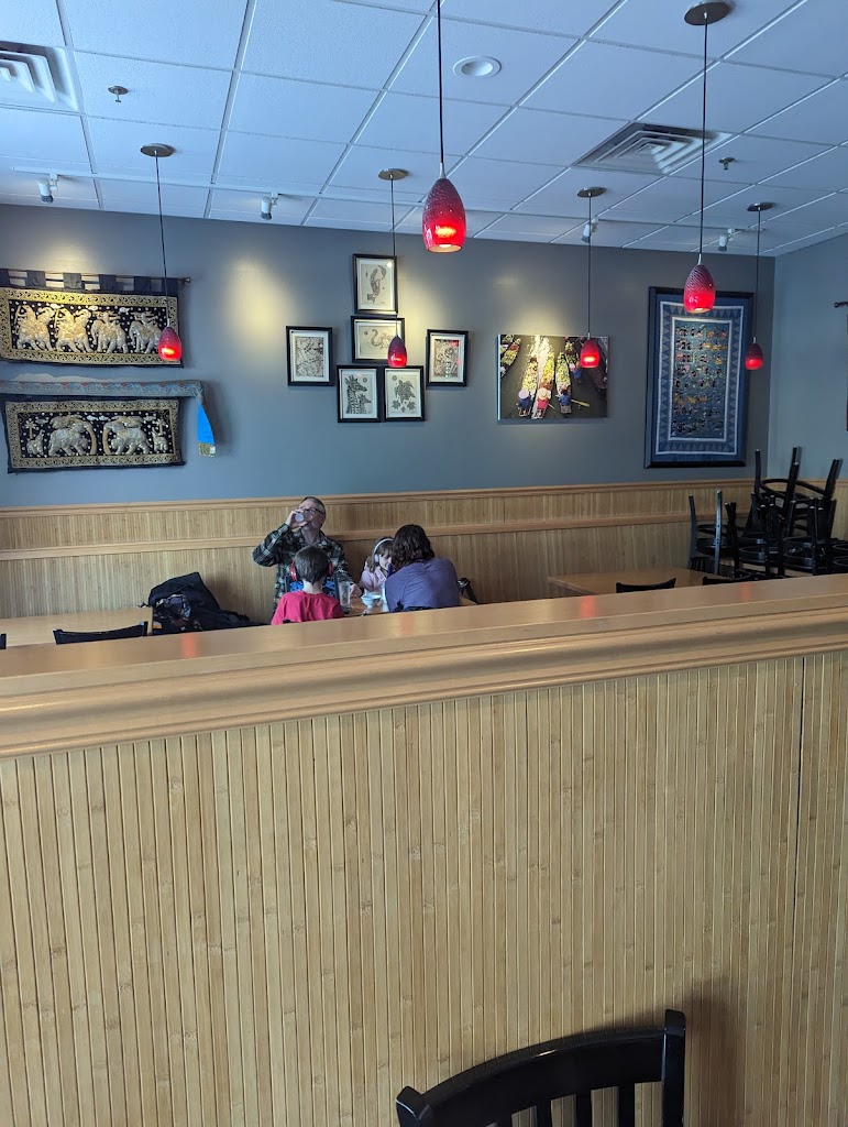 I tend to only order takeout, but thought a review was due. I get the green coconut curry dish with chicken and a spice level of three on occasion. It has some heat, but I like spicy food. This dish is very good. The veggies seem to be well cooked and the flavors are great. One order is enough for two good-sized servings. I’ve tried green curries elsewhere in the area and they aren’t nearly as good as this one.