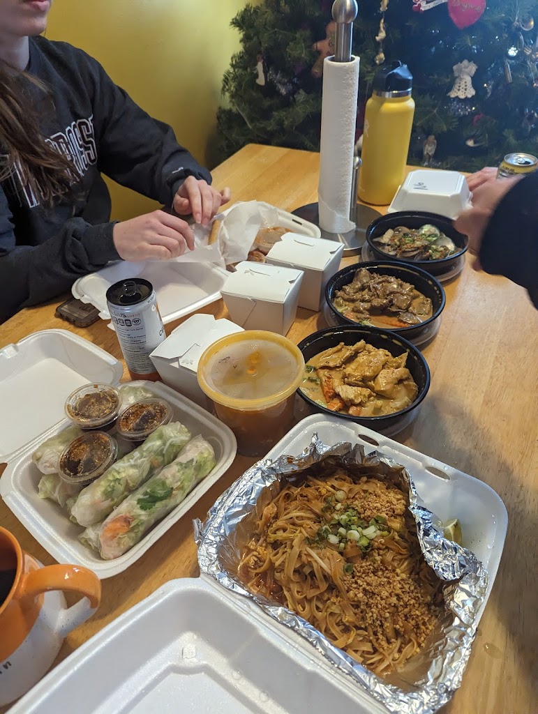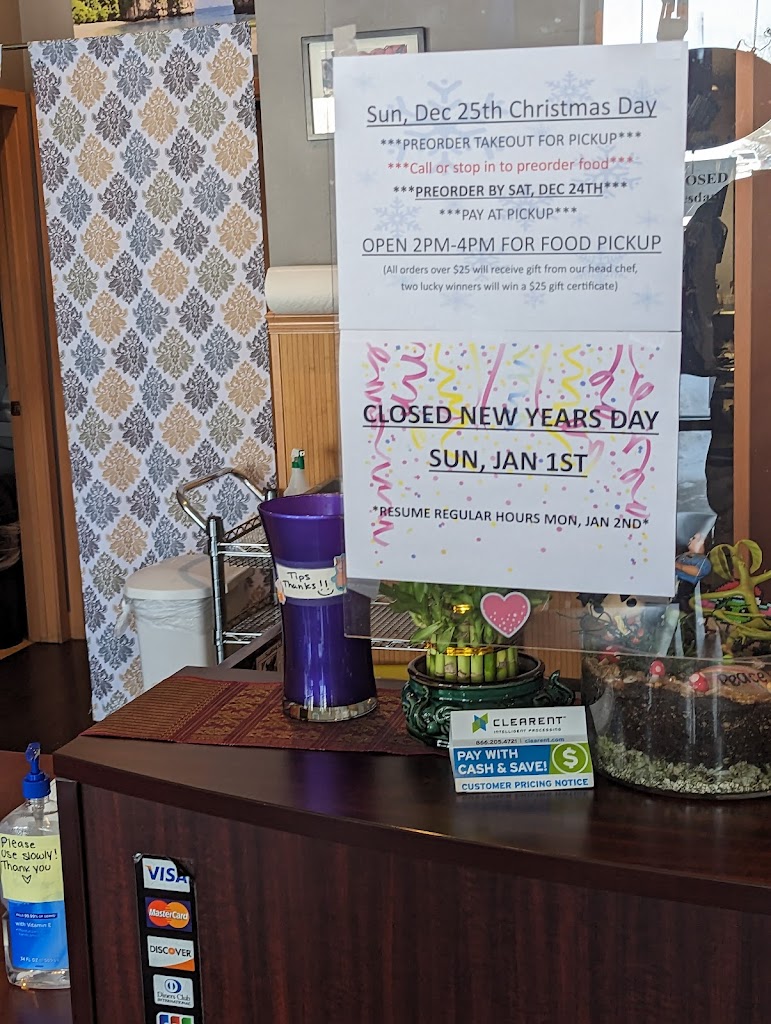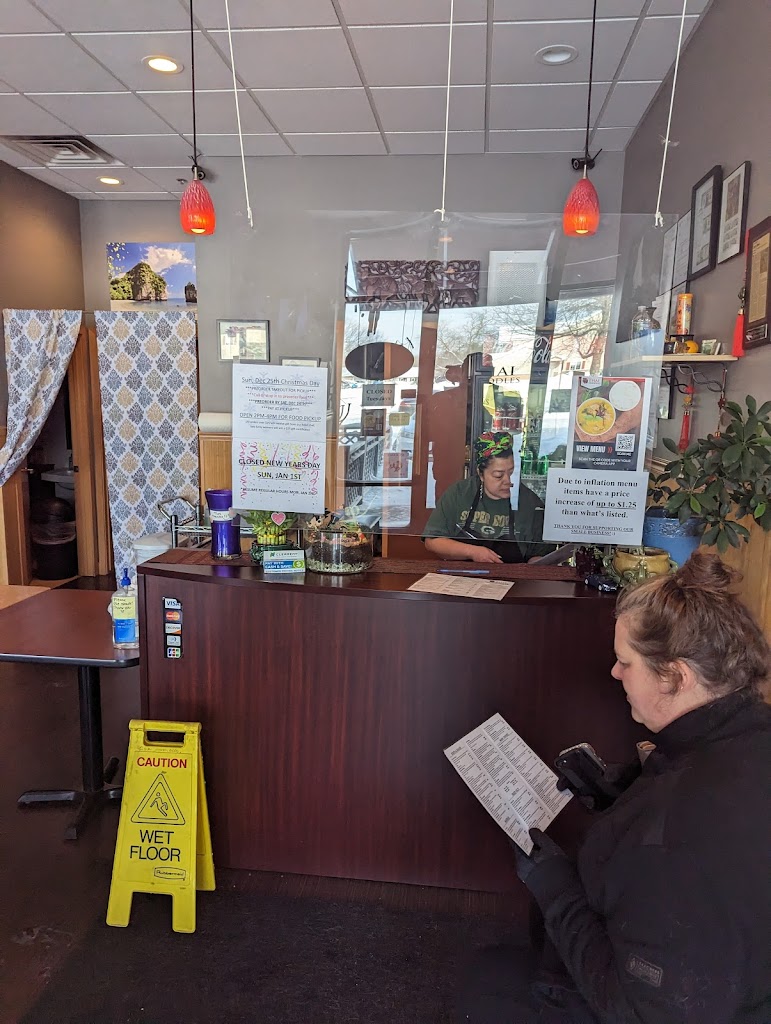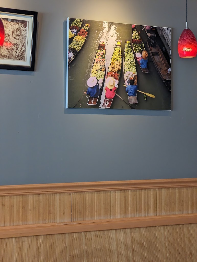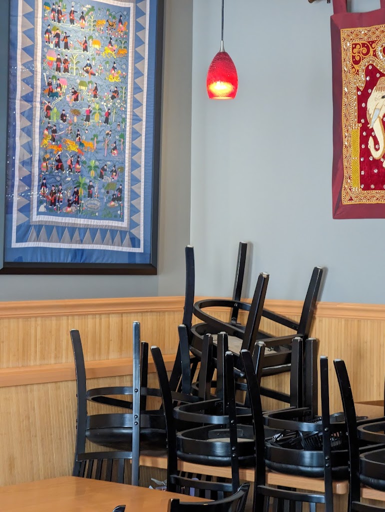 I tend to only order takeout, but thought a review was due. I get the green coconut curry dish with chicken and a spice level of three on occasion. It has some heat, but I like spicy food. This dish is very good. The veggies seem to be well cooked and the flavors are great. One order is enough for two good-sized servings. I’ve tried green curries elsewhere in the area and they aren’t nearly as good as this one.