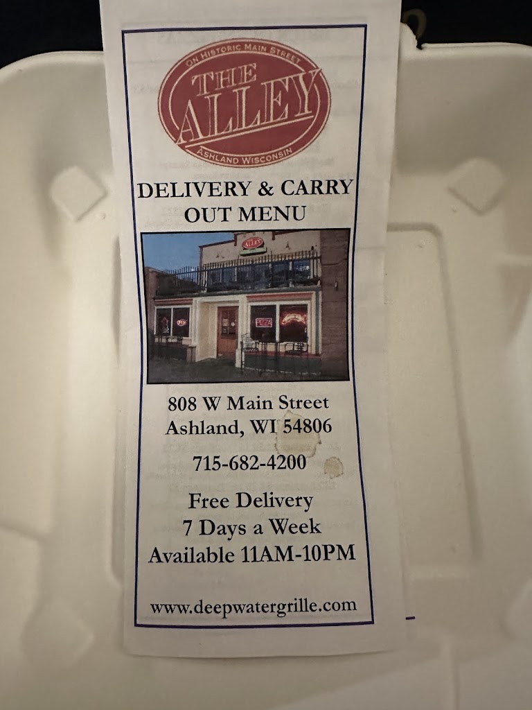 Take out and delivery of the Alley menu is available daily 11AM - 10 PM. Dine in options are limited to Fri 4 PM - 10 PM, Sat 4 PM -10 PM. Dine in options are available daily at the Deep Water Grille. Call 715.682.4200 for the current hours of operations. We ask for your indulgence during this challenging time.