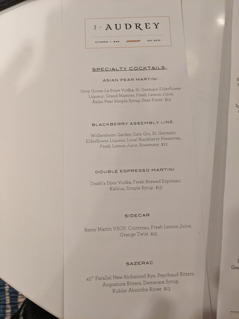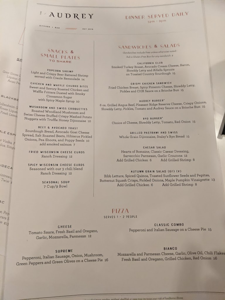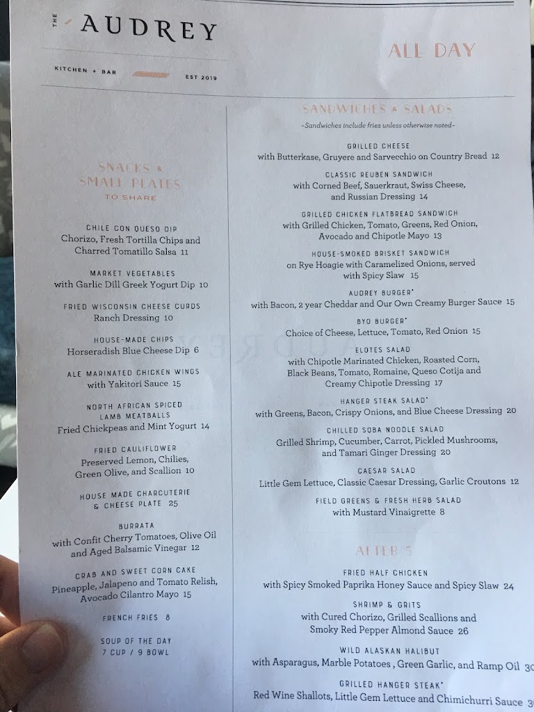Out with friends and decided to give the new Audrey a try. Wow! The renovations are beautiful and our food was fabulous. Must try the cheese curds and wings - everyone loved both of these appetizers. I enjoyed my Elotes salad - fresh ingredients and a great dressing. The drink menu was fun and they had a good selection of beer and wine. Definitely a place we would go back to!