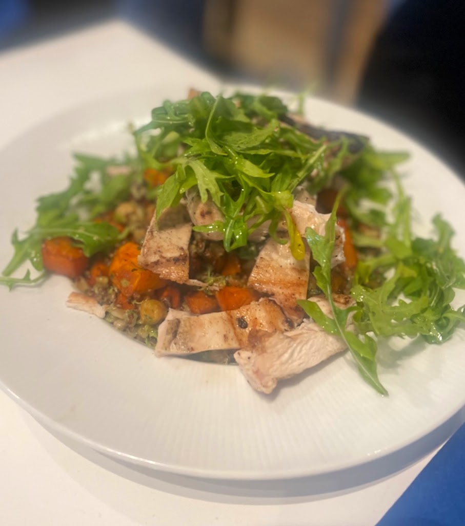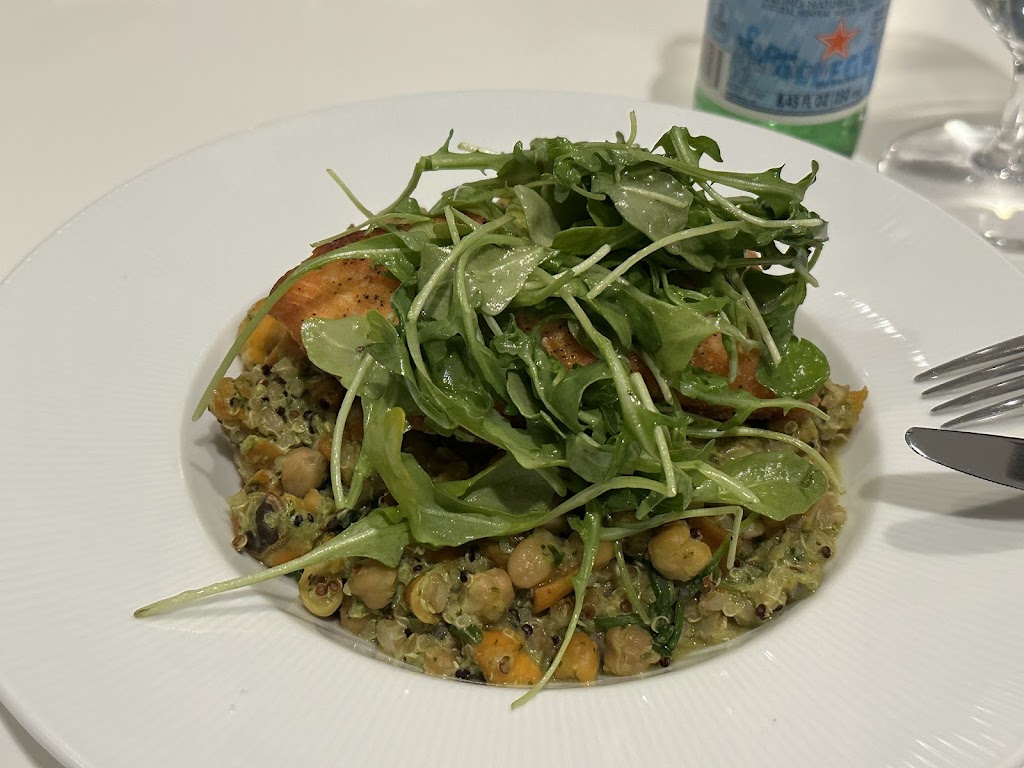 I chose what I thought was a cold salad bowl and added a seared Salmon as an extra topping. The grain bowl consisted of quinoa , sweet potatoes and a spiced version chickpeas that was warm (or warmed up) and a bit of a “blob” . Salmon was okay but definitely well overcooked.
