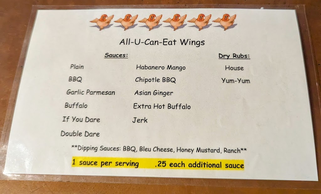 Great place to eat for best prices. They have all you can eat wings wednesdays and thursdays afternoons.