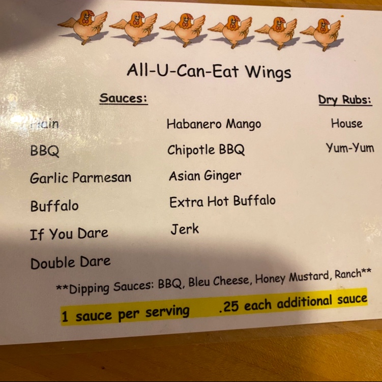 We've gone here for wings a few times, and they're outstanding! Wing Wednesday offers all you can eat for 13 dollars. These aren't buffalo wild wings. These are real wings!! You get 8 to start, then 4 each time after. Most people probably dont go beyond the 1st 12 because you get such good-sized wings. They have mild to medium and dry rubs, so if you like wings, they'll have your flavor. It gets busy, so it's best to get there right around 5 to beat the rush and get a seat. Service can be slow as there's a large amount of people, and it sounds like they're short staffed, like many other bars/restaurants. Go here for wings, and you won't be disappointed!!