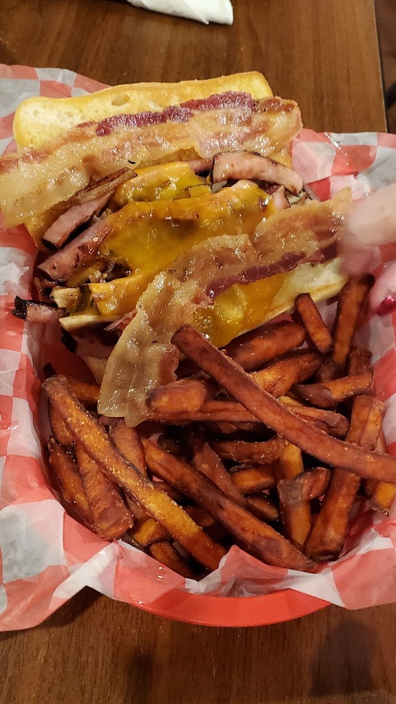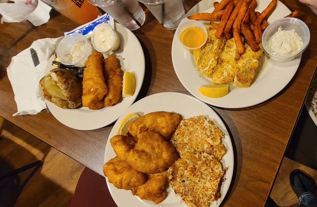 Yummy Friday Fish Fry Bluegills with Potato Pancakes, slaw. Nice tasting Clam chowder but all liquid. Great Barrel Pork Sandwich and Sweet Potato fries.