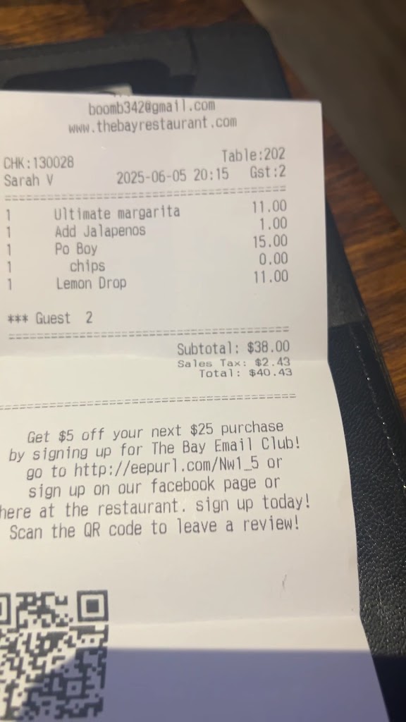 I enjoy the bay from time to time for a great drink!! The food I’m not too much of a fan of. I ordered a po boy and to my surprise the shrimp wasn’t fried I still ate it as I ordered it but wouldn’t order it again. My regular item is the chips and dip.