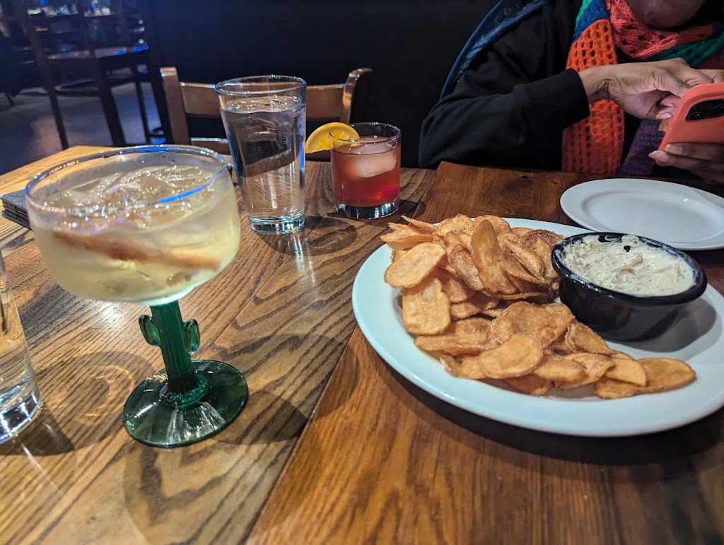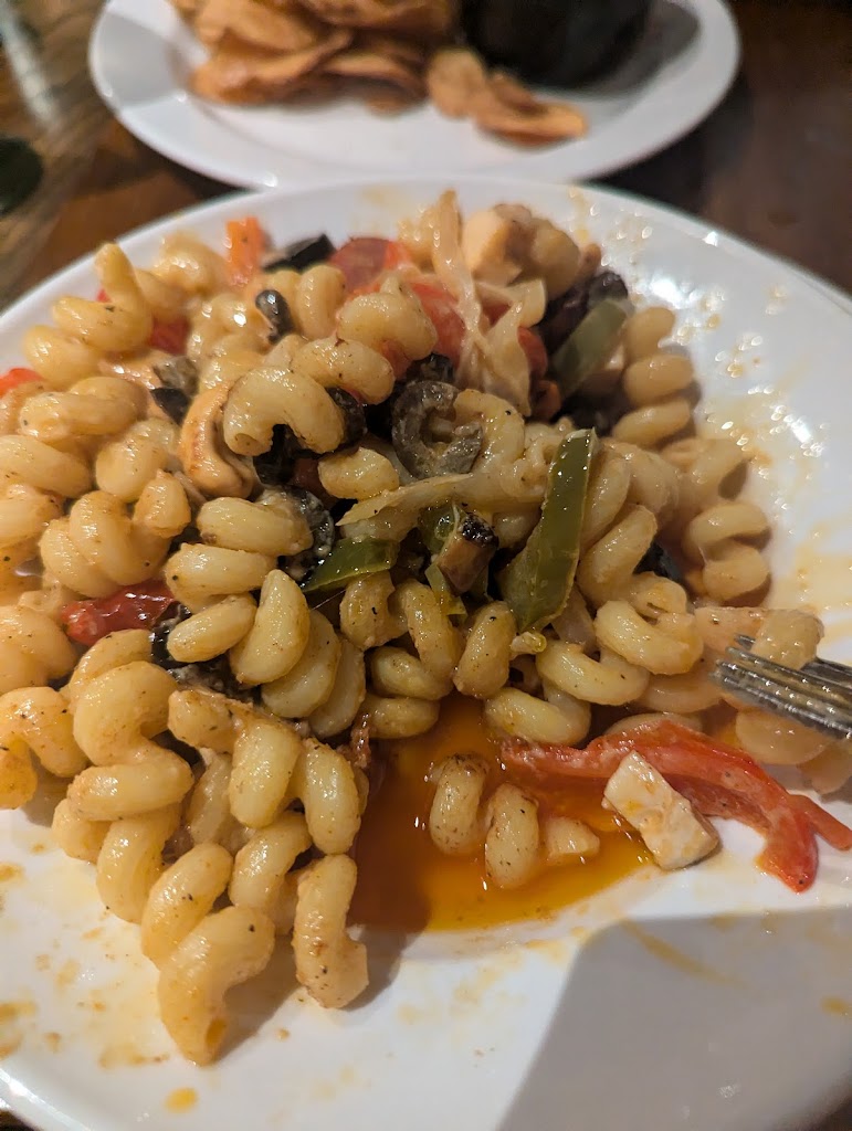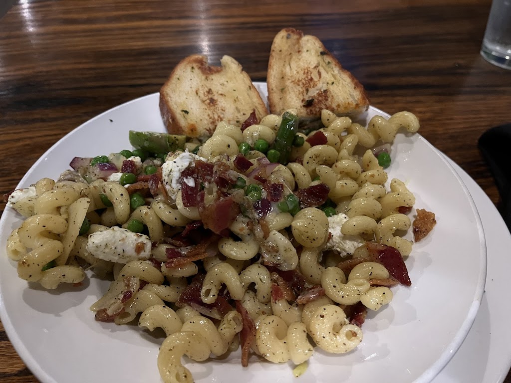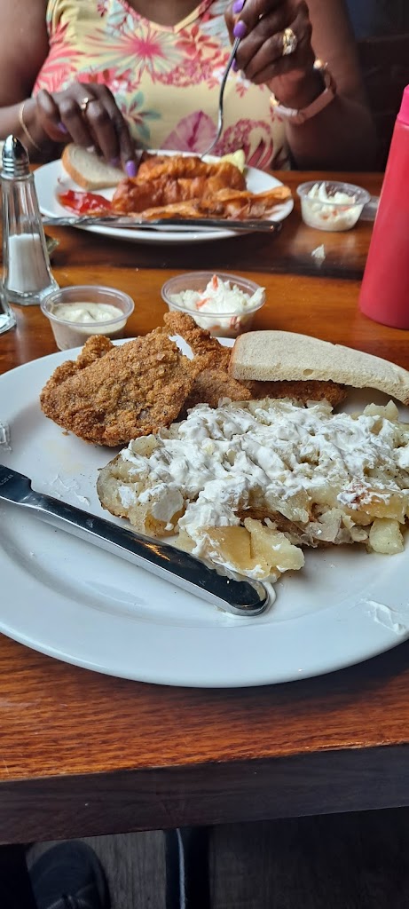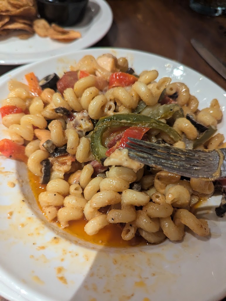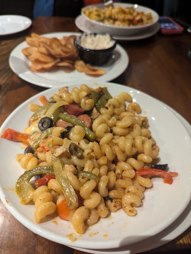 This visit we went for the Friday fish fry. Both were delicious, and the chips my husband opted for were nice and crispy. I chose the baked potato side but had to flay it myself because it was simply plopped on my plate as is. The grilled salmon on my friend's pasta plate was flavorful and flaky, but the portion size was pretty modest. The other unfortunate note is that our dishes were served more warm than hot.