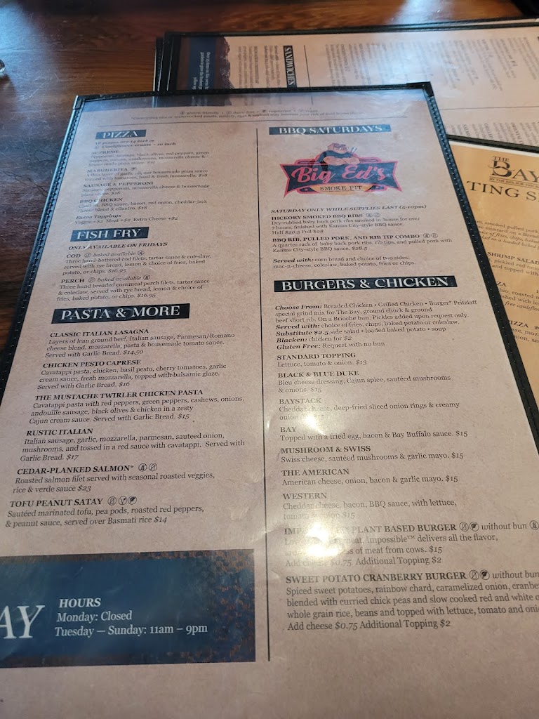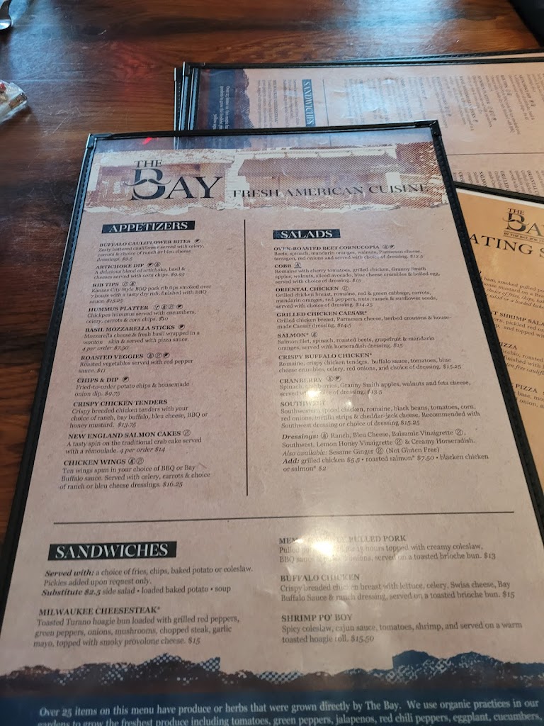 I feel like The Bay is just average in food at the price you're paying. The last time we were there my wife's burger was overdone. I'm certainly never wowed when we go there.