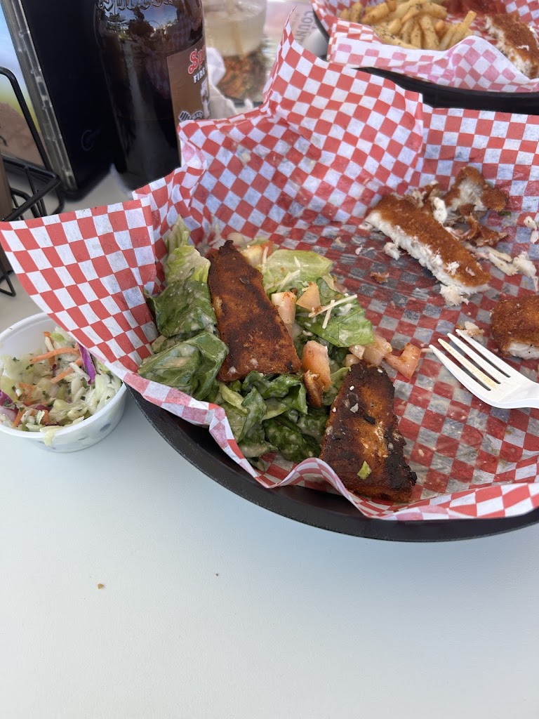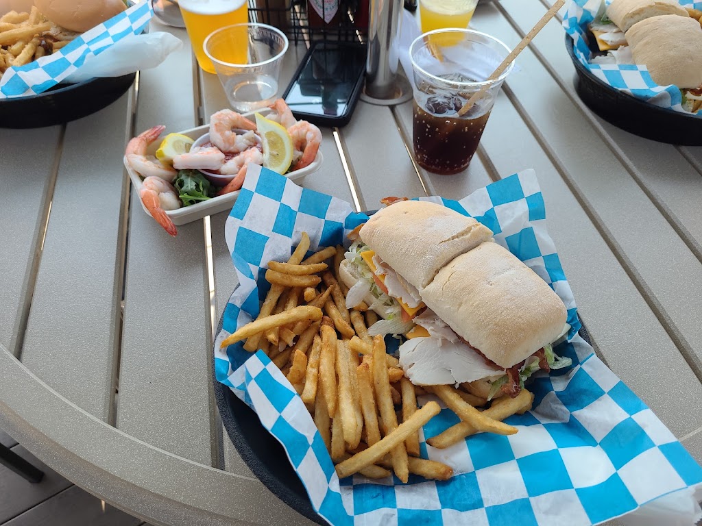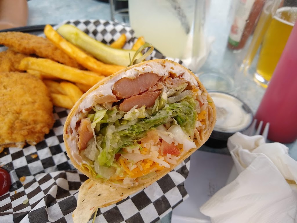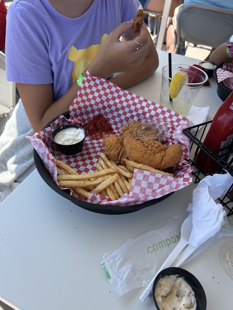 Eat outside on the roof. Great view of the water. But do be mindful that itβs like eating at Long John Silvers. Plastic silverware. Plastic plate. Paper bowl if you order salad.