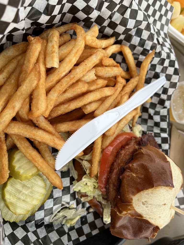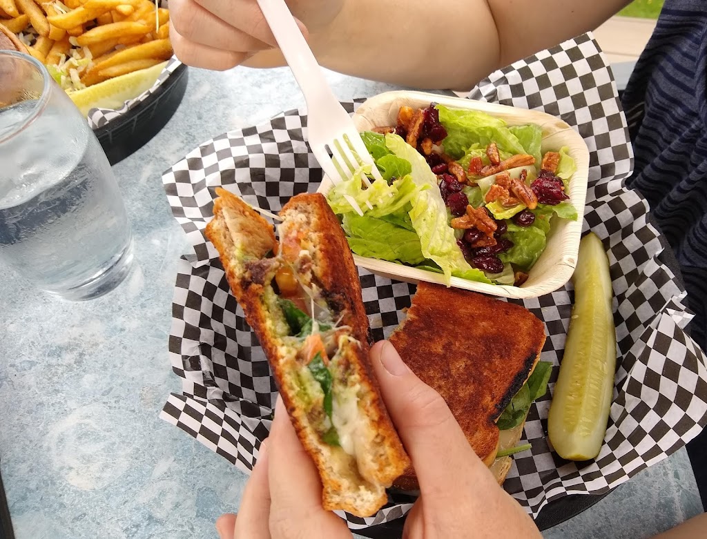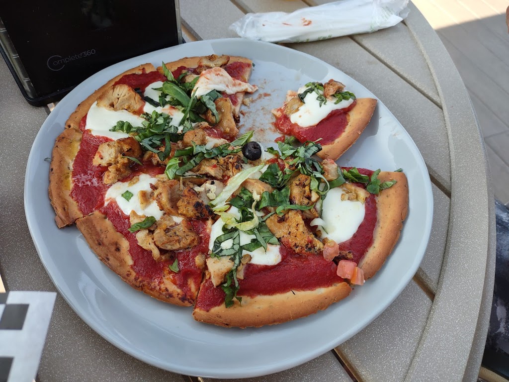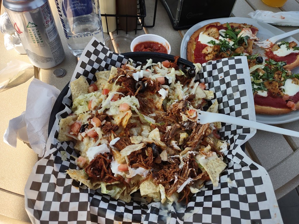 Eat outside on the roof. Great view of the water. But do be mindful that itβs like eating at Long John Silvers. Plastic silverware. Plastic plate. Paper bowl if you order salad.