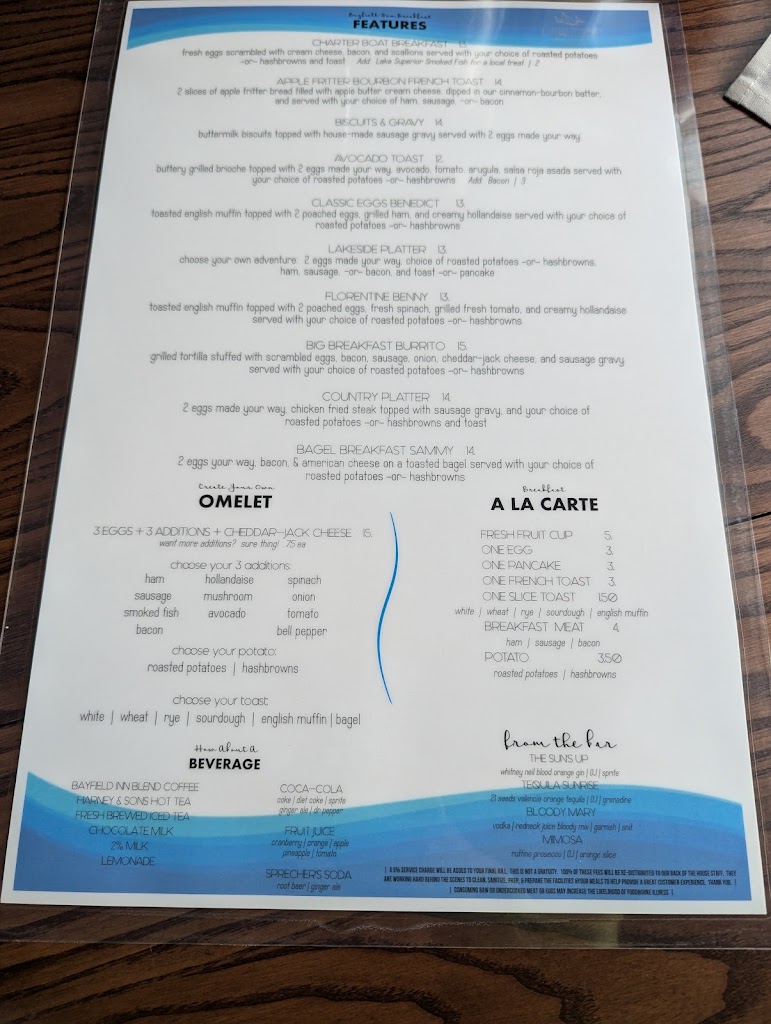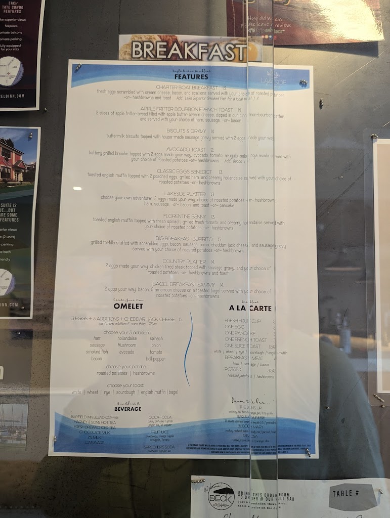 The Bayfield Inn is a stylish spot for breakfast, perfectly located in the heart of the city with stunning views of the lake and pier right from the dining area. While the space isn't overwhelmingly large, it feels open and thoughtfully designed, offering plenty of seating and ample window views for everyone to enjoy a peaceful, scenic morning.