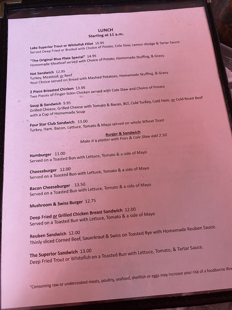 We stayed at the Bayfield Inn when we went up fishing. Check in was very nice and answered our questions. We ate dinner in the dining room and enjoyed our food. We had everything from burgers to the seafood platter. Everyone's food came out hot and timely. The beds were comfortable and the hotel was clean!