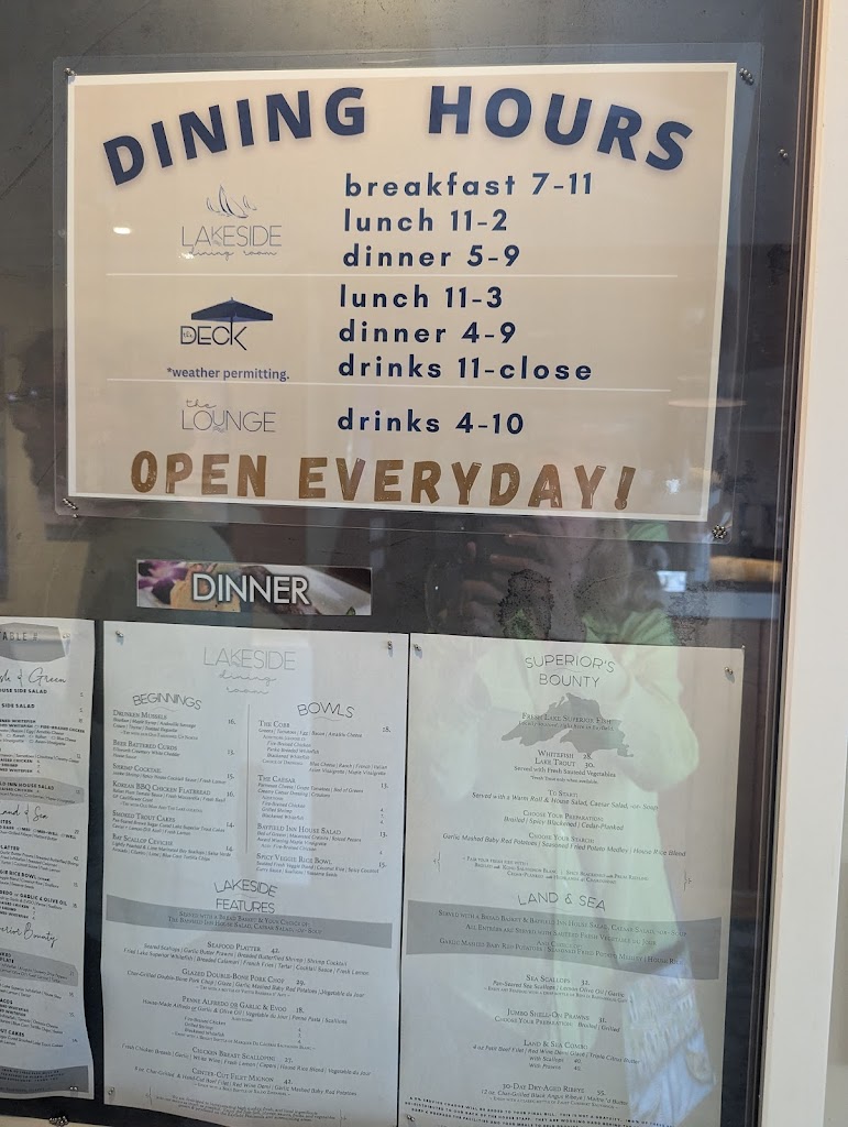 Had dinner at The Lakeside Dining Room and was not impressed. Husband had the scallops, very overdone. Garlic mashed very bland. Sever brought our food out and we never saw her again until she came to ask about dessert; dining room was not busy so not sure where or what all the servers were doing or where they were at. People waiting at the door to be seated and hostess was also mia. Expected better food and better service for the prices. Now we may understand why they were not busy. Personally we do not recommend the dining room. Very disappointed.