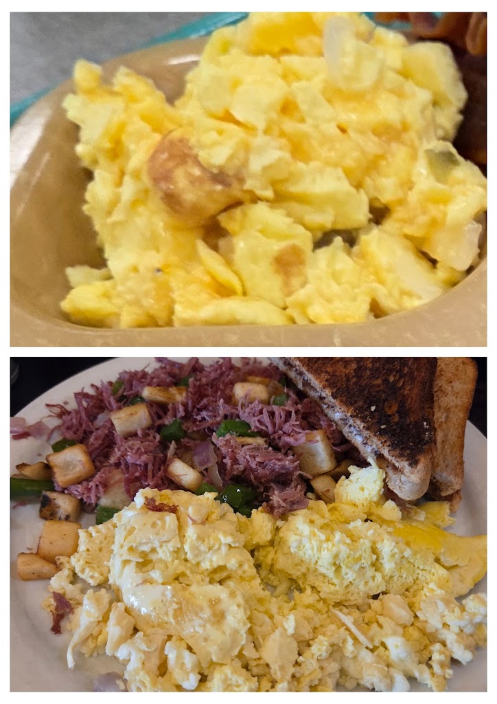 I paid $15+ for special eggs and corned beef hash. From the first bite to the last, I couldn’t figure out what was “special” about powdered eggs and flavorless corned beef hash. For contrast, I provided a reference picture: the top photo is good old U.S. Army Dining Facility powdered eggs served at Ft. McCoy, WI, and the bottom photo is what i got at The Breakfast Club & Pub.
