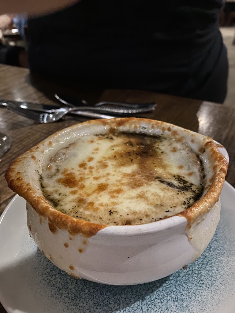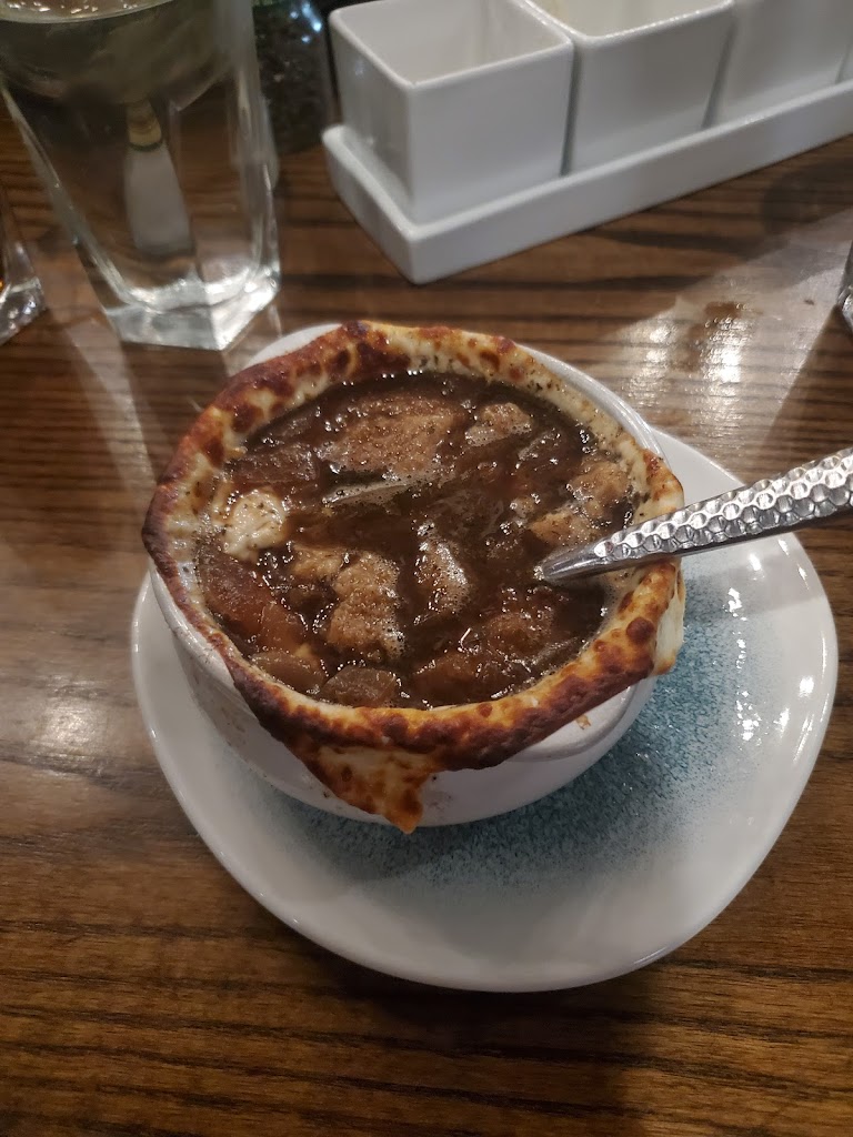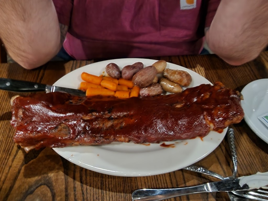 The food was amazing. I had the baked french onion soup and the smoked ribs and my husband had the salad and the 14oz. ribeye steak. The soup on it's own is a meal and I would drive the 2.5 hour trip again just to eat that soup. The death by chocolate cake dessert is delicious. Our server, Kari, was friendly, had a good sense of humor, and made the meal worth every penny.