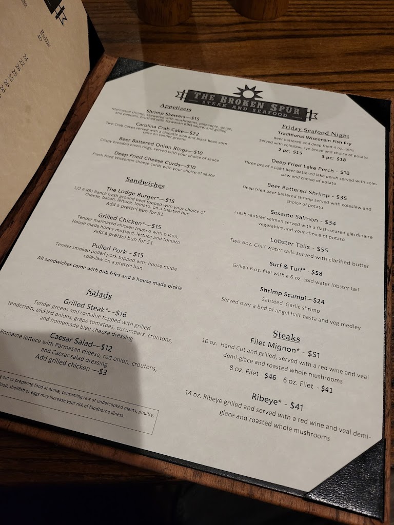 The Broken Spur Steak and Seafood Restaurant, located within The Lodge at Mauston, is dedicated to provide a sophisticated experience in fine dining. We pride ourselves as a contemporary steakhouse, featuring a menu with unique robust selections perfectly cooked just the way you like it. Join us for a signature dining experience. Our full-service bar features craft brews along with choice wines and cocktails. We look forward to serving you and your guests.