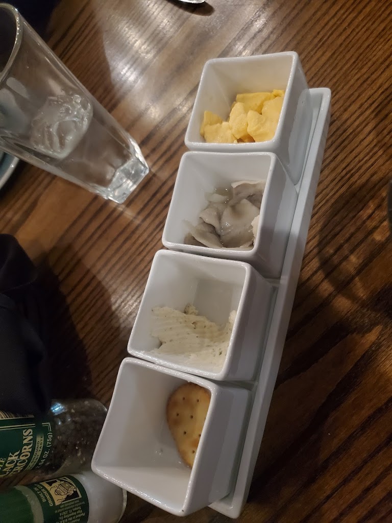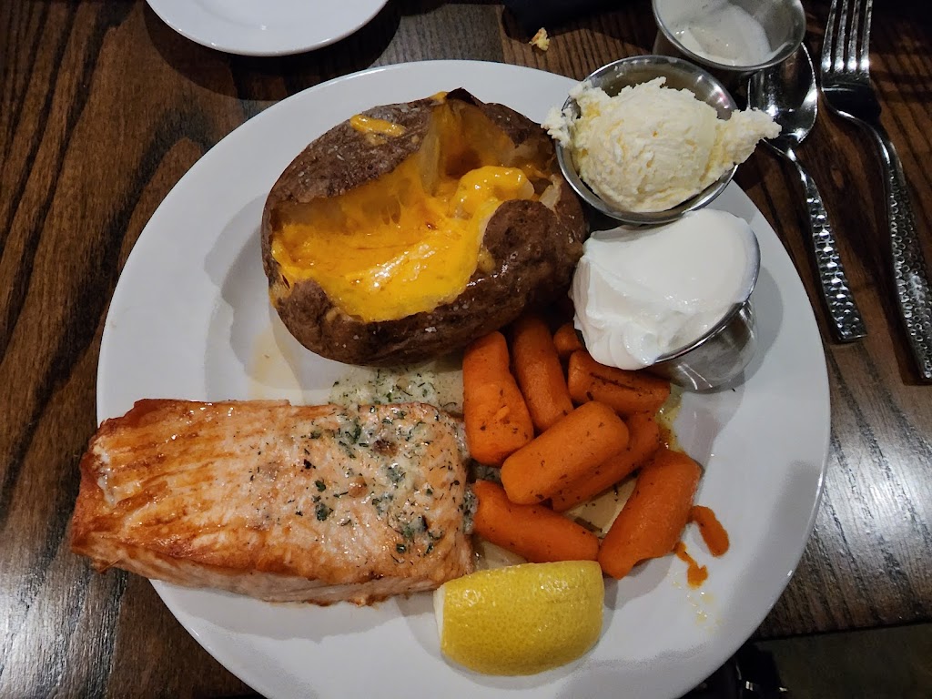 Anywho,… Ordered the baked fish, that came with coleslaw. The fish had absolutely no flavor to it.. I asked for melted butter… Which was definitely not melted butter… It was vegetable oil. My friend had the baked fish also and said that she had the same opinion… Absolutely no taste to it, and she also had the baked potato Which she said was cold. The salad bar was an up charge of four dollars… Which had lettuce, dressing, a plain tasting Generic cottage cheese, mushrooms… And that’s about it.