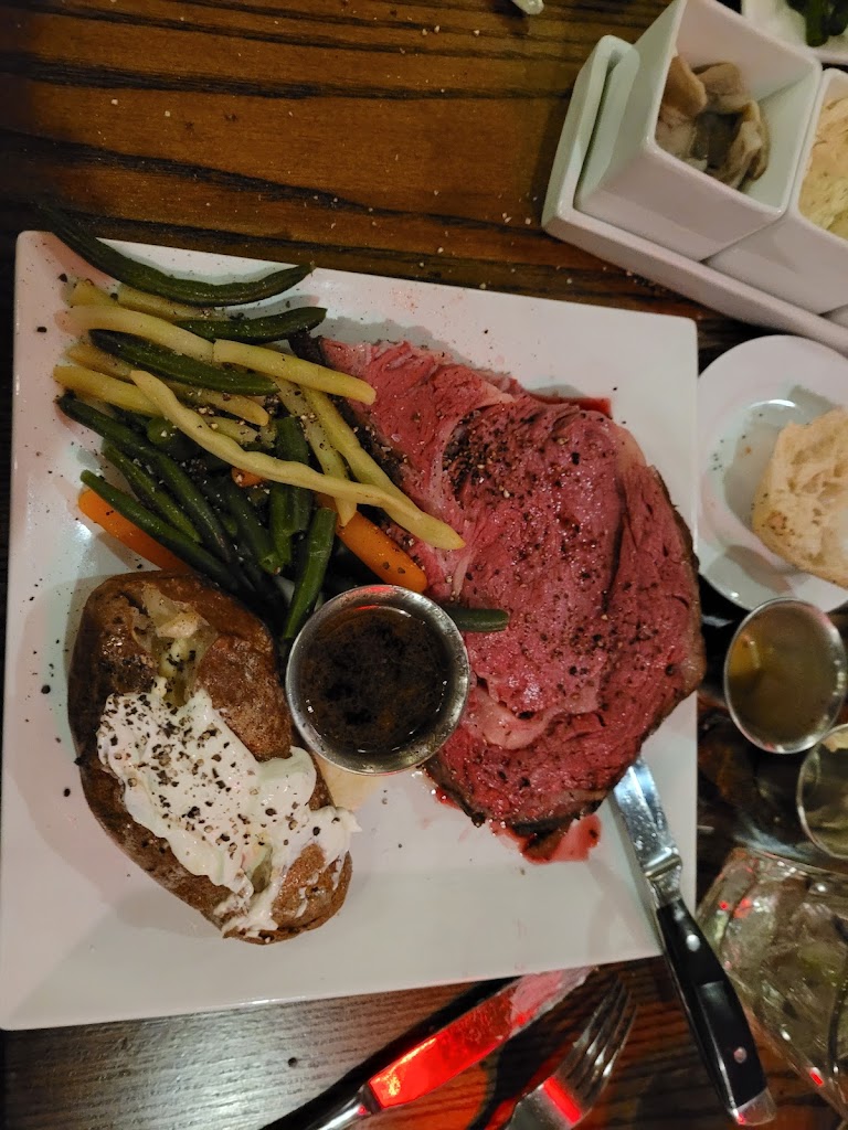 We decided to give this place another shot and boy are we glad we did. Much more prompt service! The freaking bruschetta is THE best I've ever had! Definitely coming back for that! The prime was okay, a bit overseasoned but good. Salads were great, the dinner rolls are soooo good! Love the cheese n crackers too!! We were only able to eat half our meal, so we enjoyed prime n eggs for breakfast