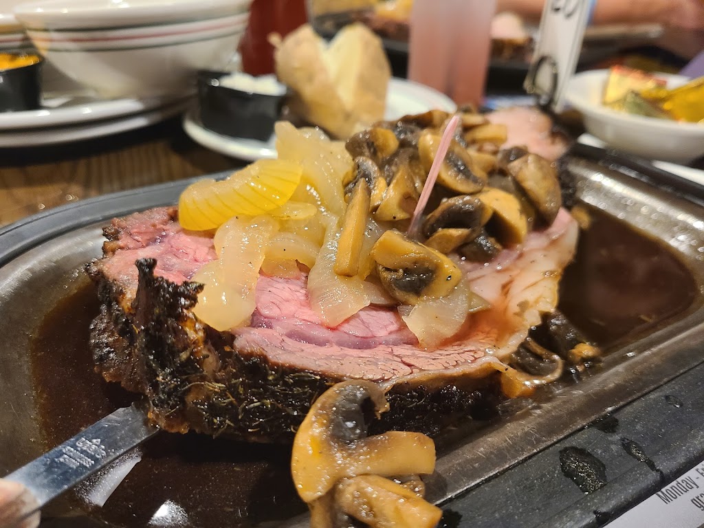 Food - meh. Salad bar ok, it's just a salad bar. We did an appetizer of mushrooms, onion rings and pickle chips. Nothing spectacular. I ordered the queen cut prime rib with the garlic and onion seasoning. It was ok, nothing great. My wife ordered the perch dinner. No flavor, none. No salt or pepper. Just baked fish. The food isn't worth what they charge.