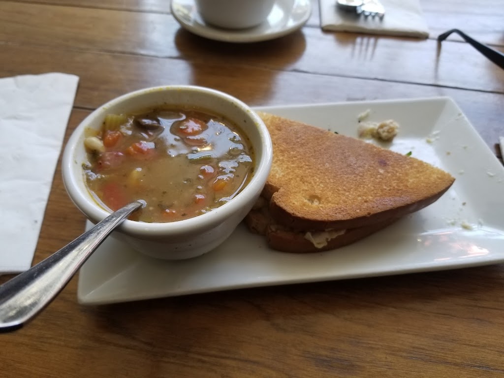 The coffees were good, but not the food. ingredients on the Turkey Melt were poorly distributed, so every bite was a very strong flavor of one ingredient (eg, mustard) and turkey, rather than a little of each. The meat on the Strogonoff sandwich was tough and seemed boiled. The chicken soup was lukewarm at best.