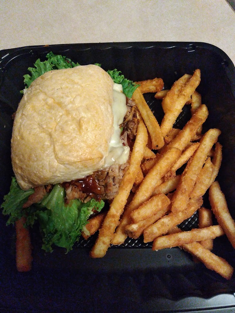 I went here on a Saturday night around 9:00 the bar grill area was pretty slow so service was quickI ordered the Sriracha pulled pork sandwich and it came with fries the receiving pickles on itit was a great sandwich! will order againI called in my order before I got to the restaurant and it was ready by the time I got there about 5 mins.