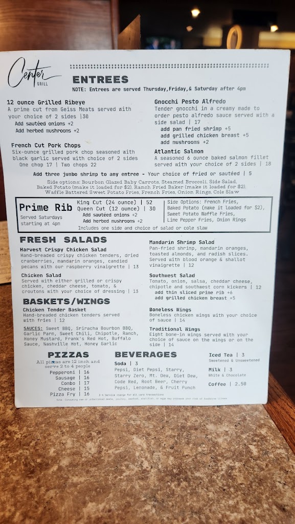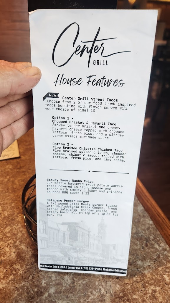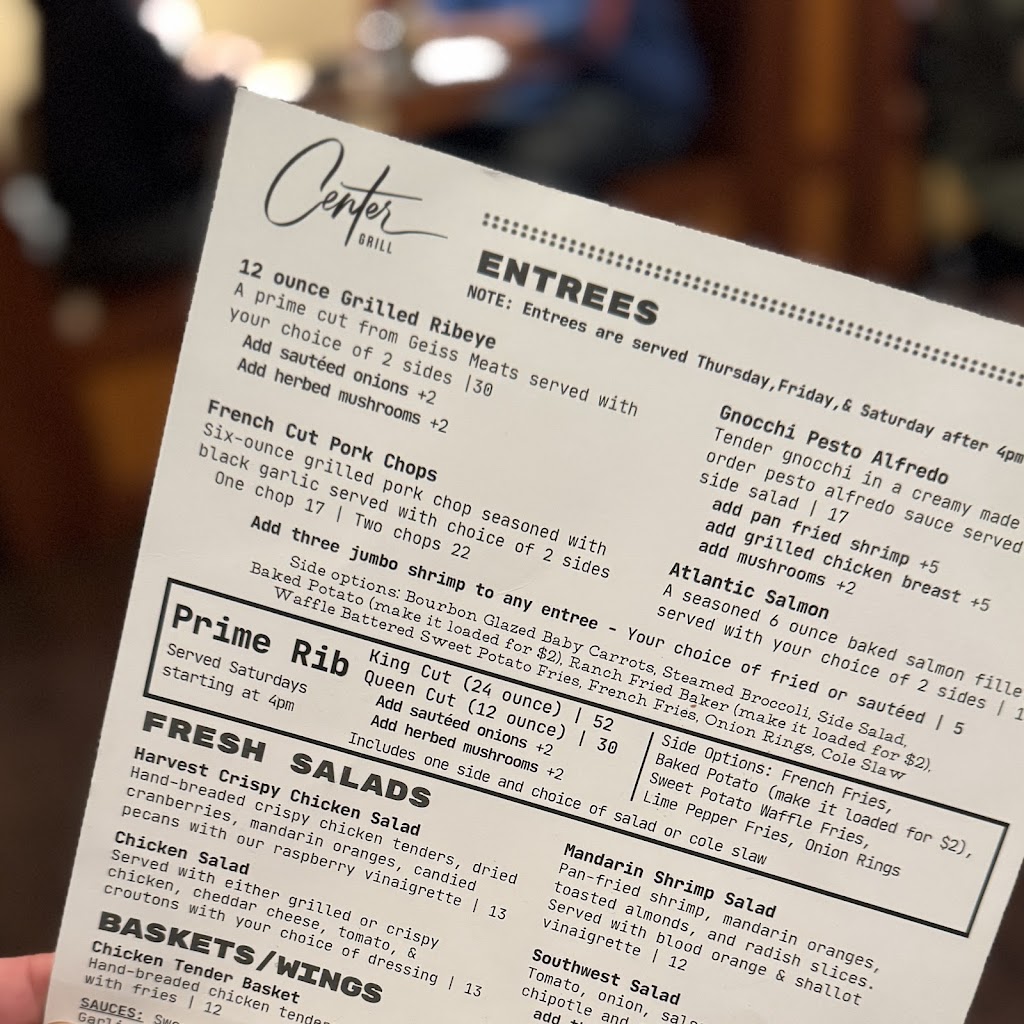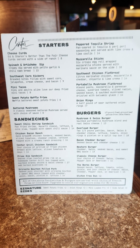 Excellent food. The Center Grill serves great options from burgers, chicken wings, to more fancy options.