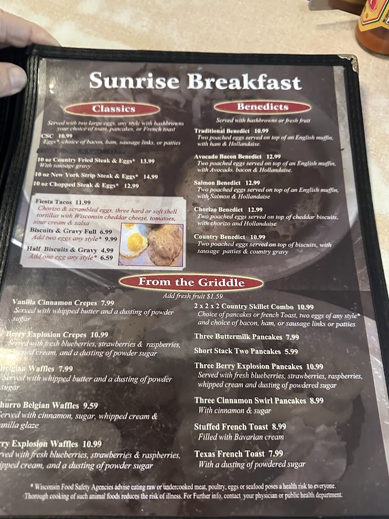 Had a great breakfast! Lots of food!! Cozy and friendly. They were open on Memorial Day! High five to them for working a holiday! We will be back.