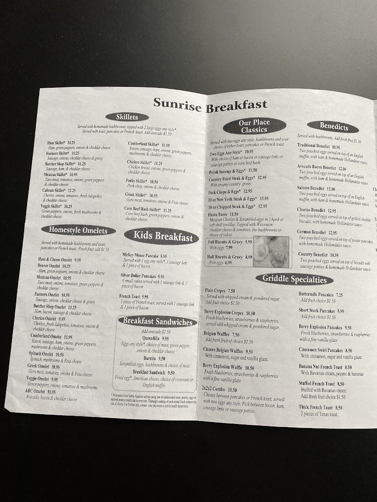 Fantastic skillets and omelets! Everything comes with your side choice of pancakes, French toast, or toast. Even fresh berries in December!
