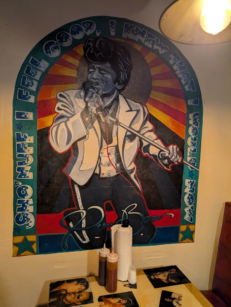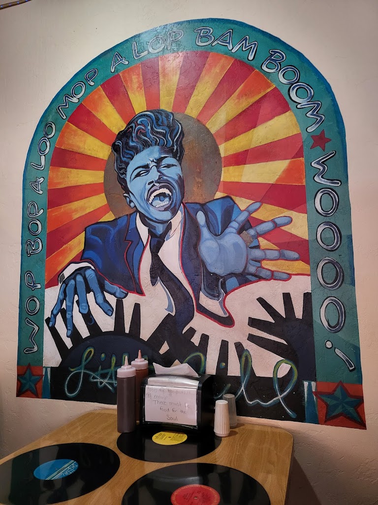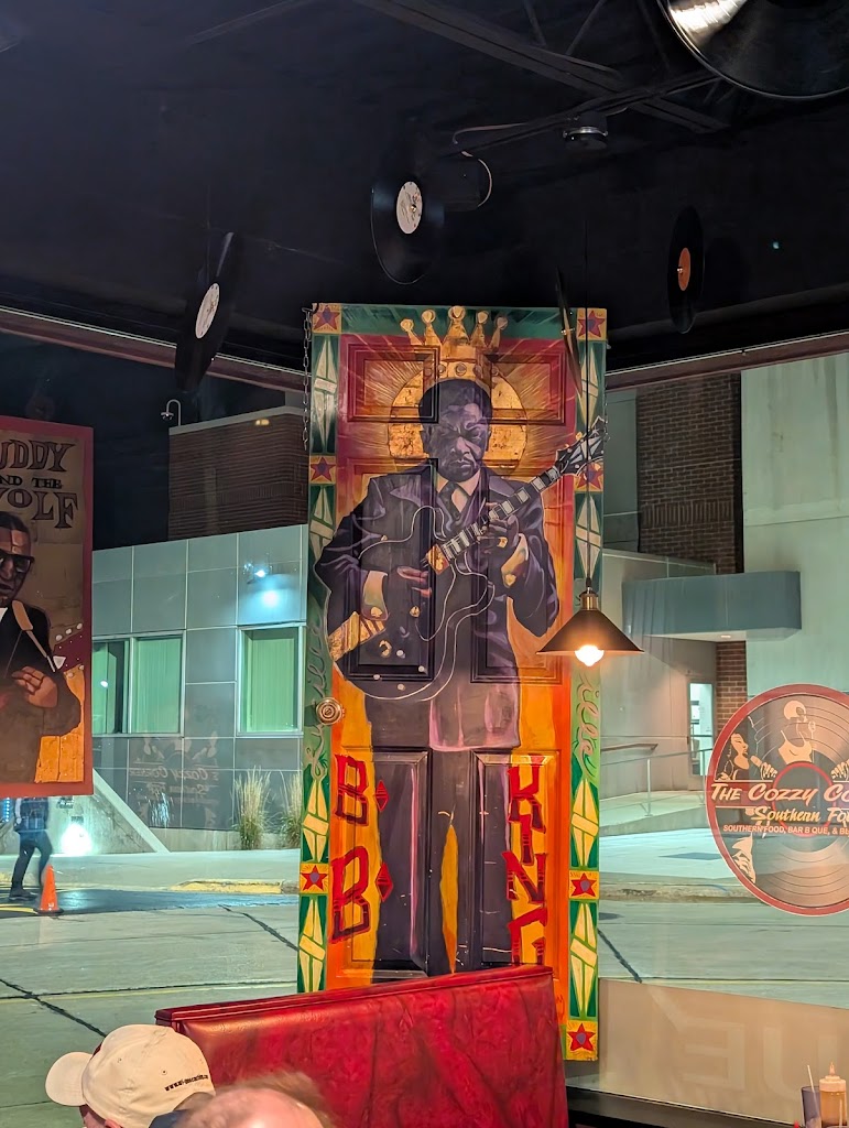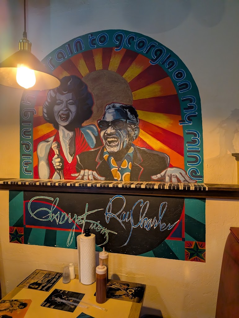 Saw this on Google maps while in town visiting and thought I’d give it a try. The decorations, murals , and music were all of black musicians during the blues era. It was amazing to look at and there were many conversation pieces to talk about while waiting for our food.