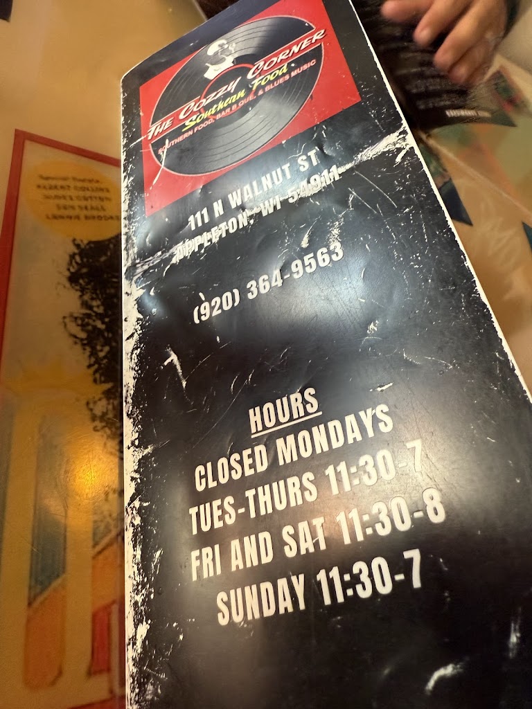 Had a wonderful dining experience while in Appleton. The Cozzy Corner is a must, if you're in town for a visit or work! The food was amazing with great portions for the price. The atmospheric and music made me very comfortable.The staff was very kind and inviting which made my experience even more rememberable. Whenever I'm back in Appleton this will be my first stop!