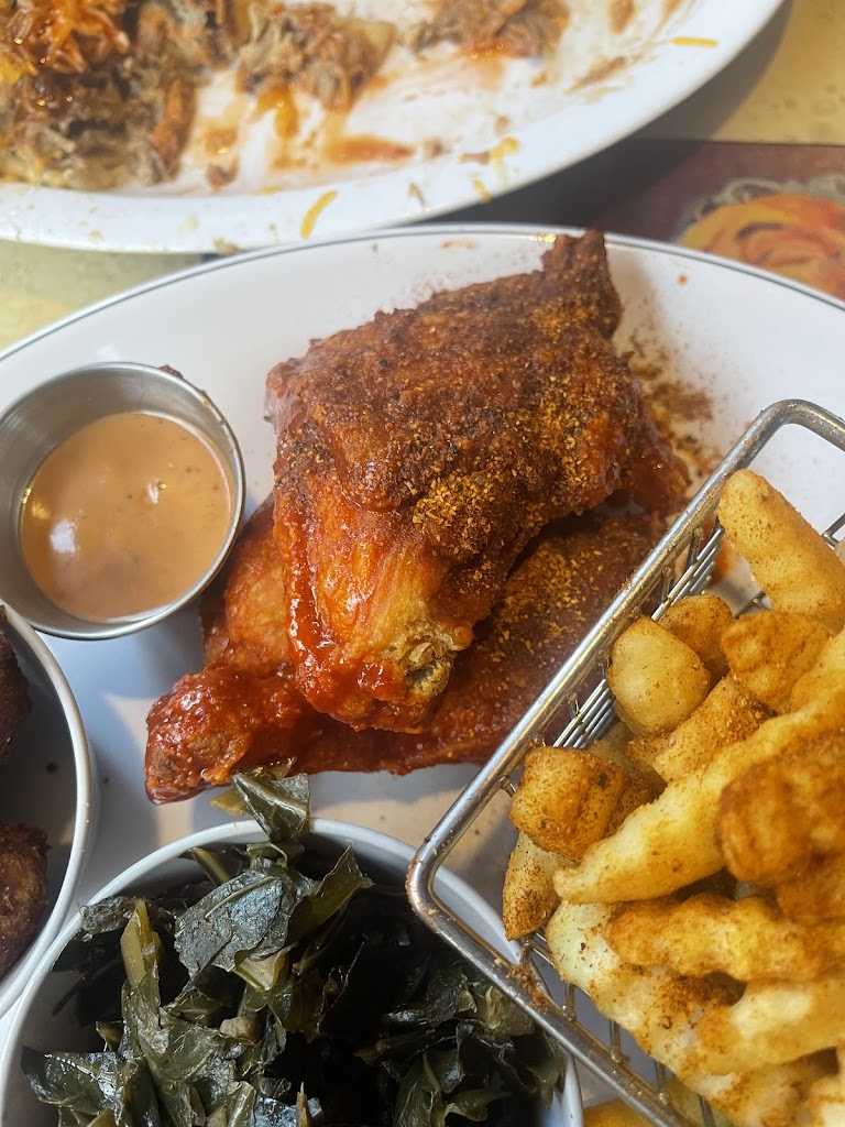 I ordered the Kings platter and my wife ordered pecan chicken and waffles. The kings platter gave me a chance to try a little bit of everything and I really enjoyed the chicken wings and hot sauce. What I didn’t enjoy was the mac and cheese. I can’t pin point what it is but my guess is maybe American cheese? I could be wrong , but it definitely didn’t taste that good.